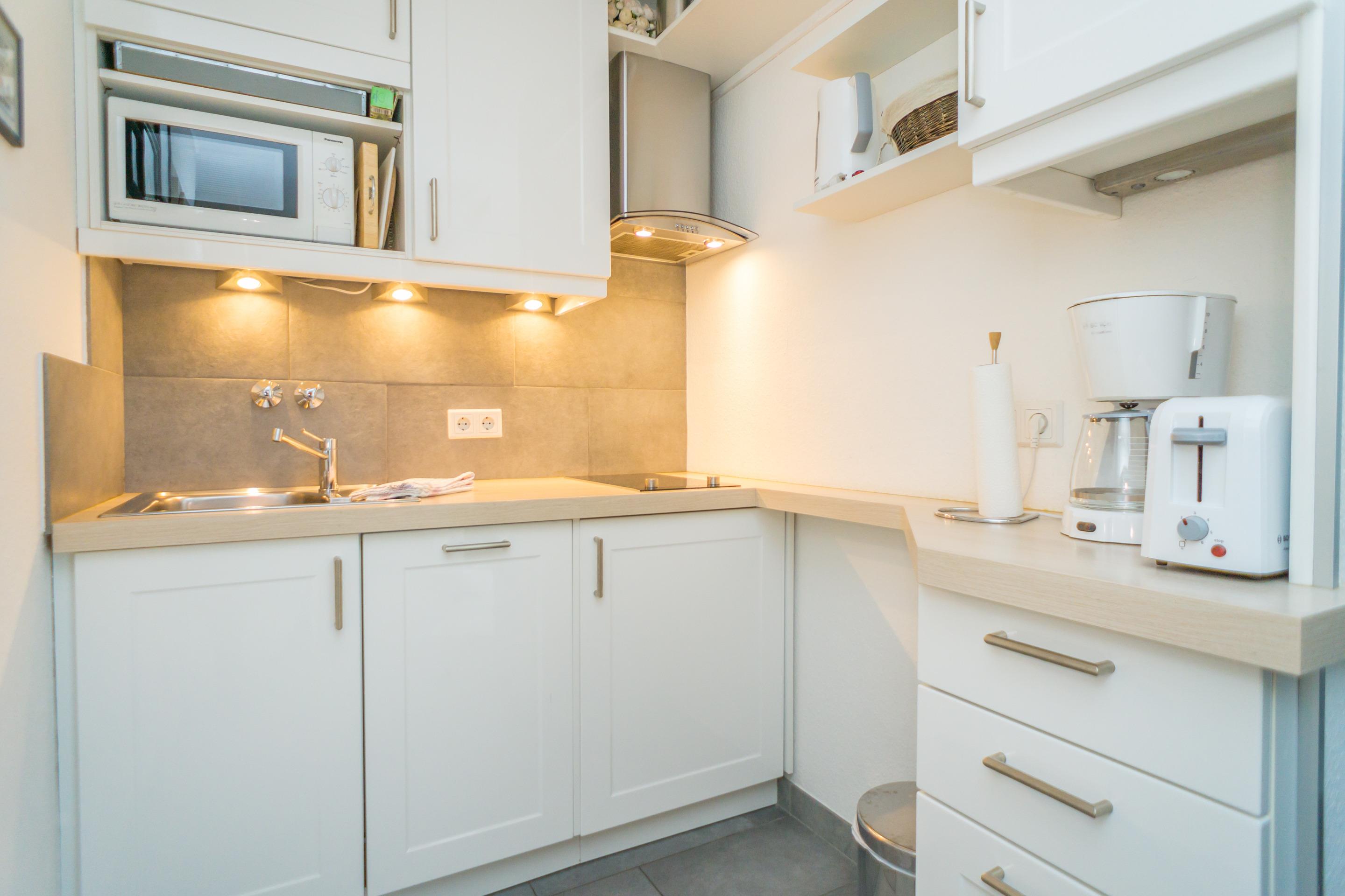 Die moderne Küchenzeile ist mit Geschirrspüler, Ceranfeld (2 Kochfelder), Mikrowelle und Kühlschrank ausgestattet. Kaffeemaschine, Wasserkocher und Toaster gehören zur Grundausstattung.