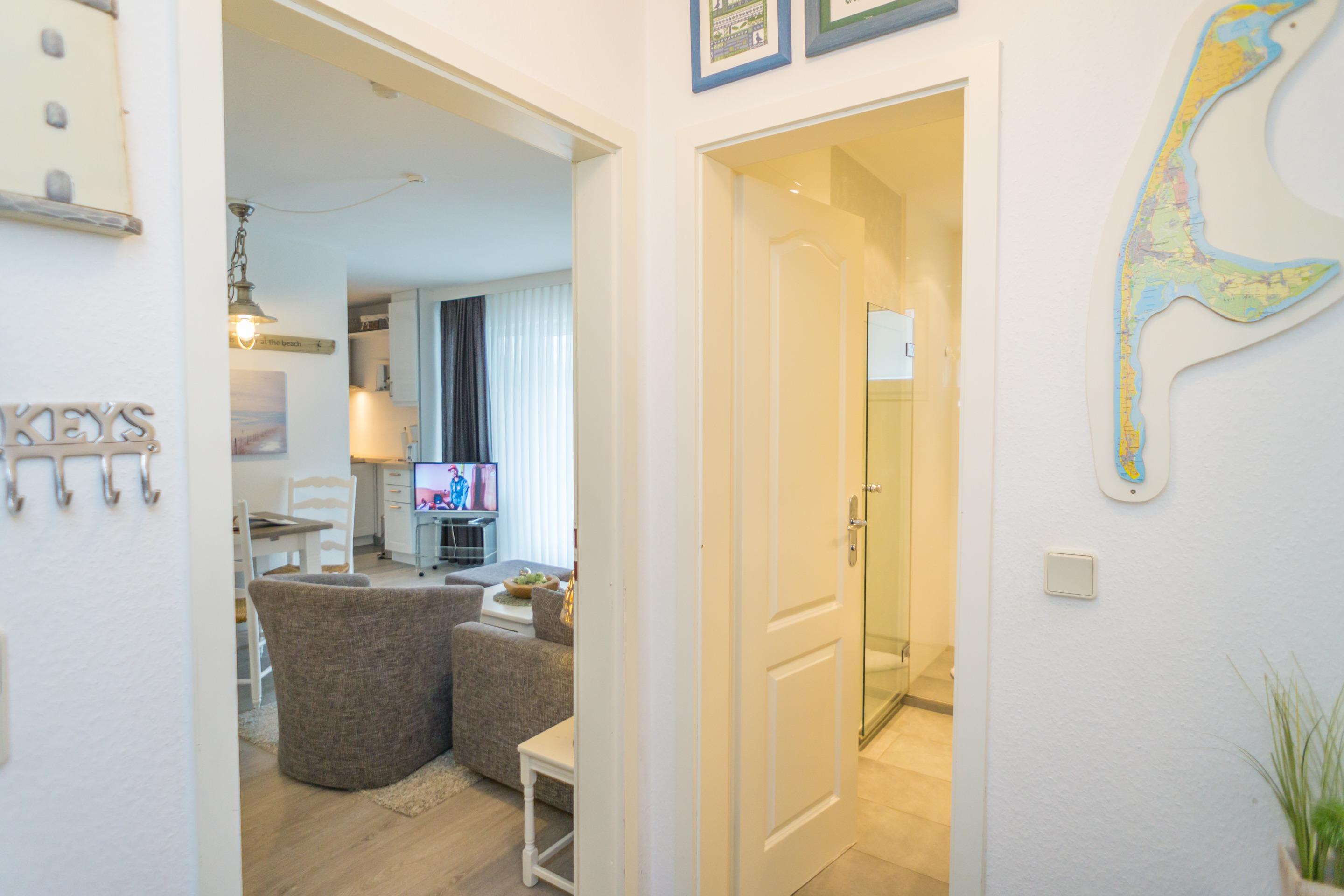 Vom Vorflur mit Garderobe gelangt man in das helle Wohnzimmer (mit Austritt zur Terrasse) und in das neue, moderne Duschbad/WC.