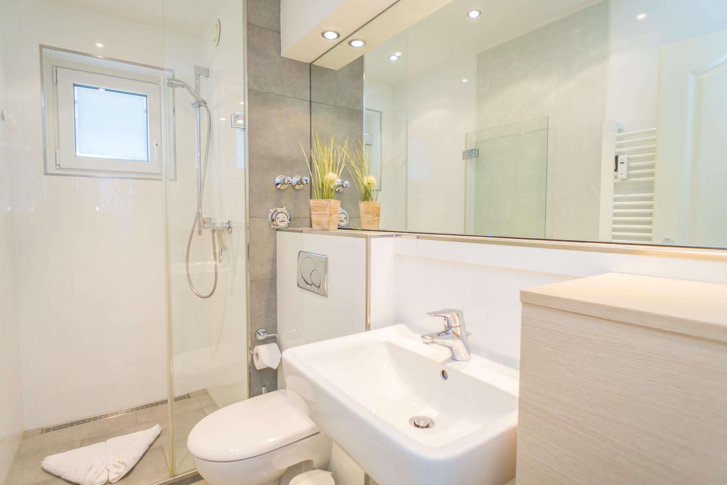 Im neuen Badezimmer befindet sich eine Dusche mit extrem niedrigen Einstieg, ein Waschtisch, ein Handtuchtrockner, WG und ein Fenster.