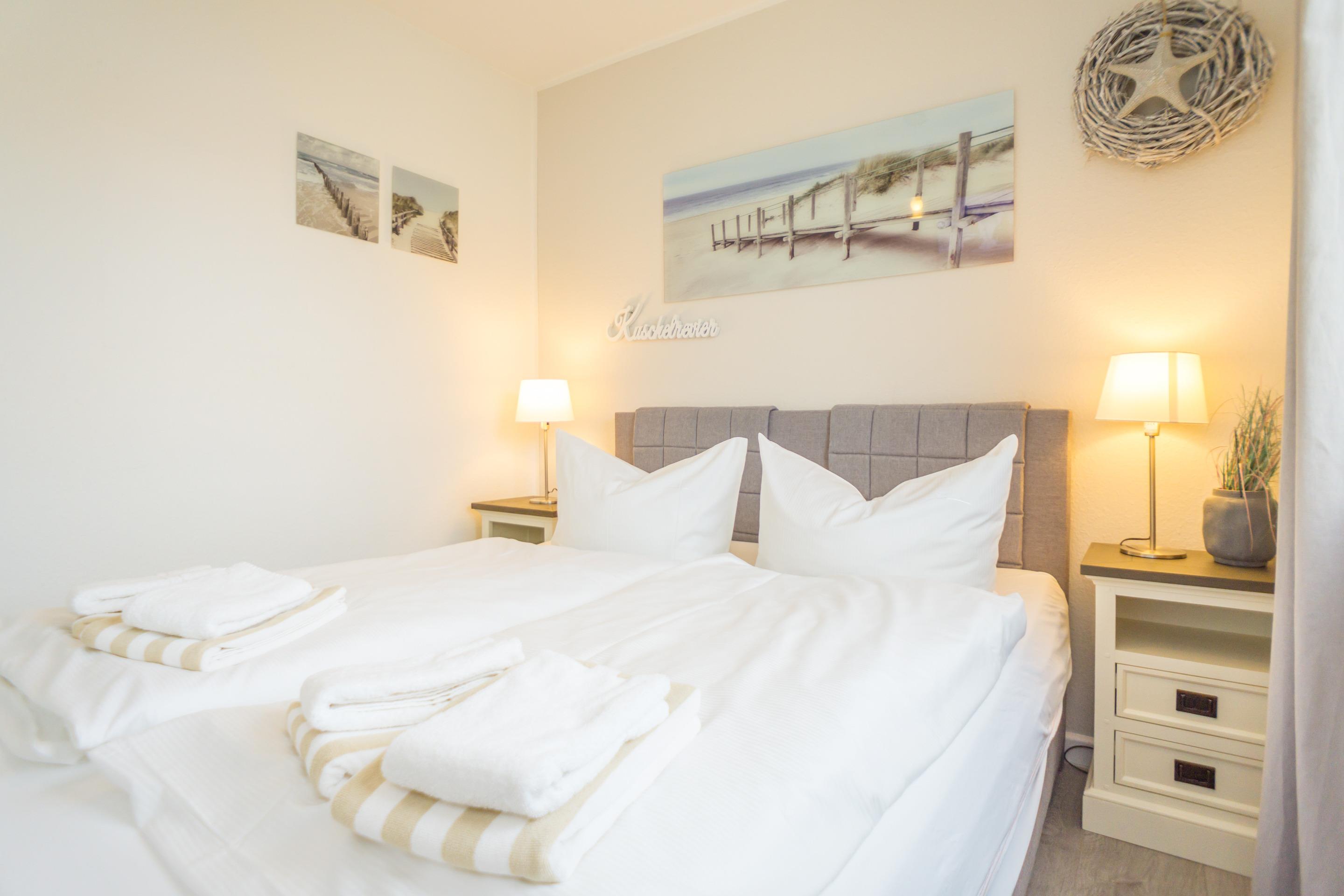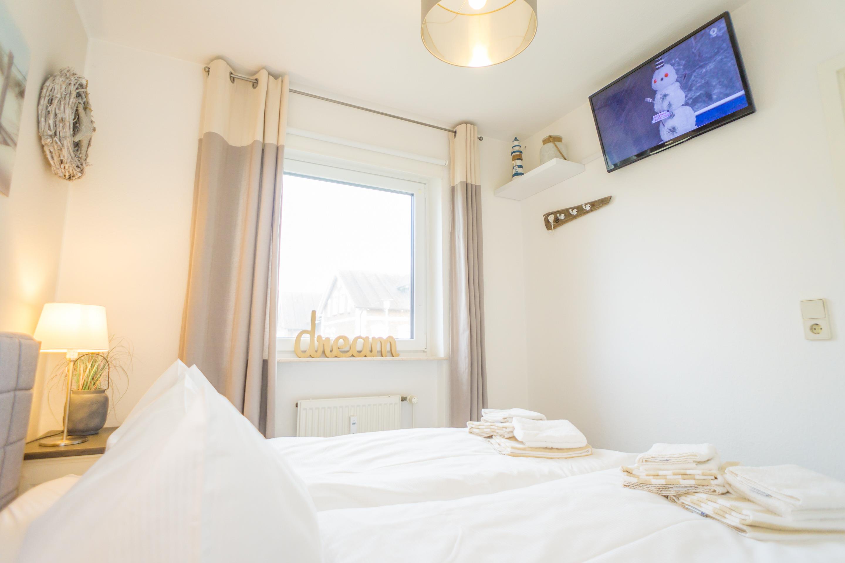 Das Schlafzimmer hat ein gutes, neues Doppelbett (durchgehende Matratze: 1,60 x 2,00m)und einen zusätzlichen Flachbild-TV.