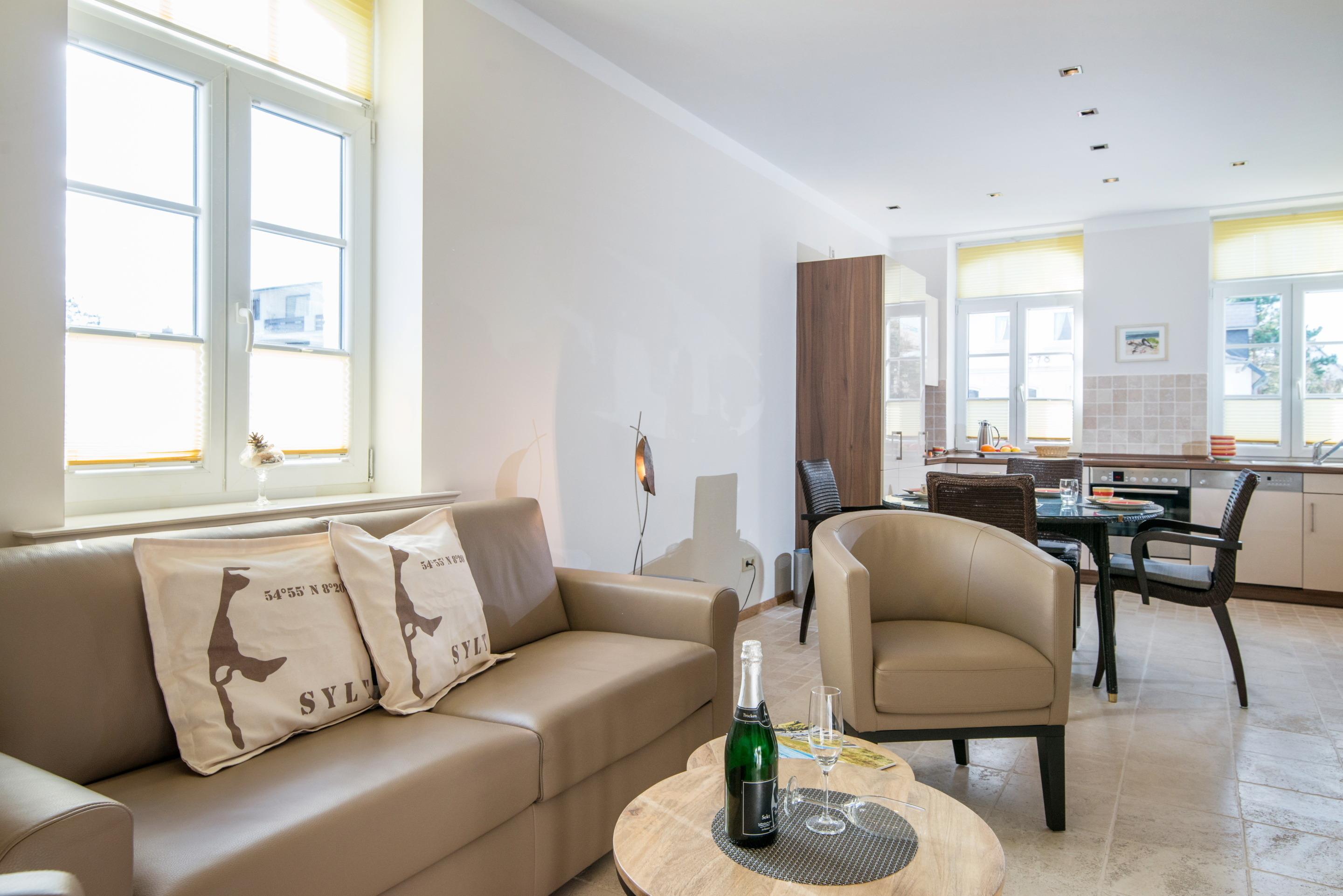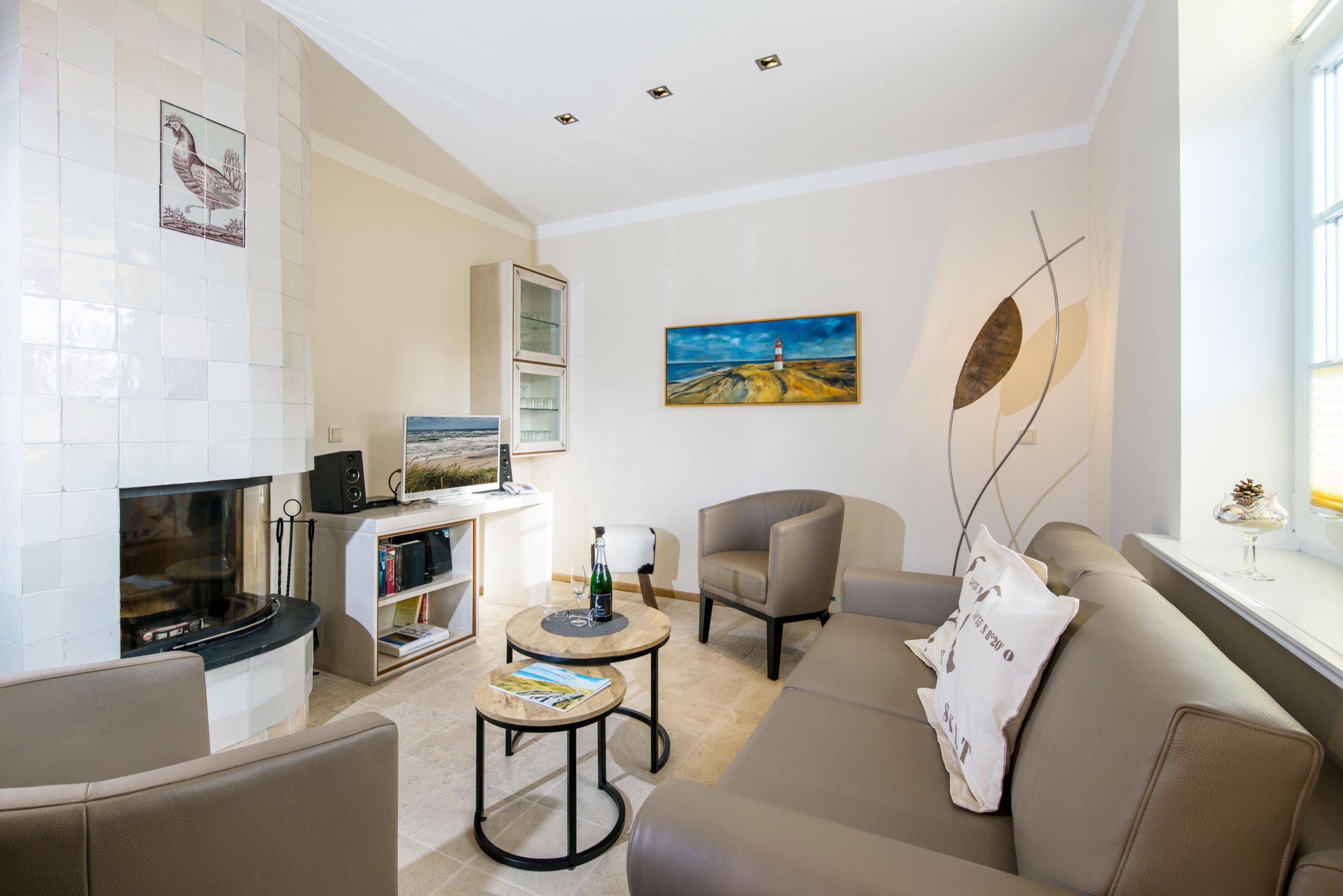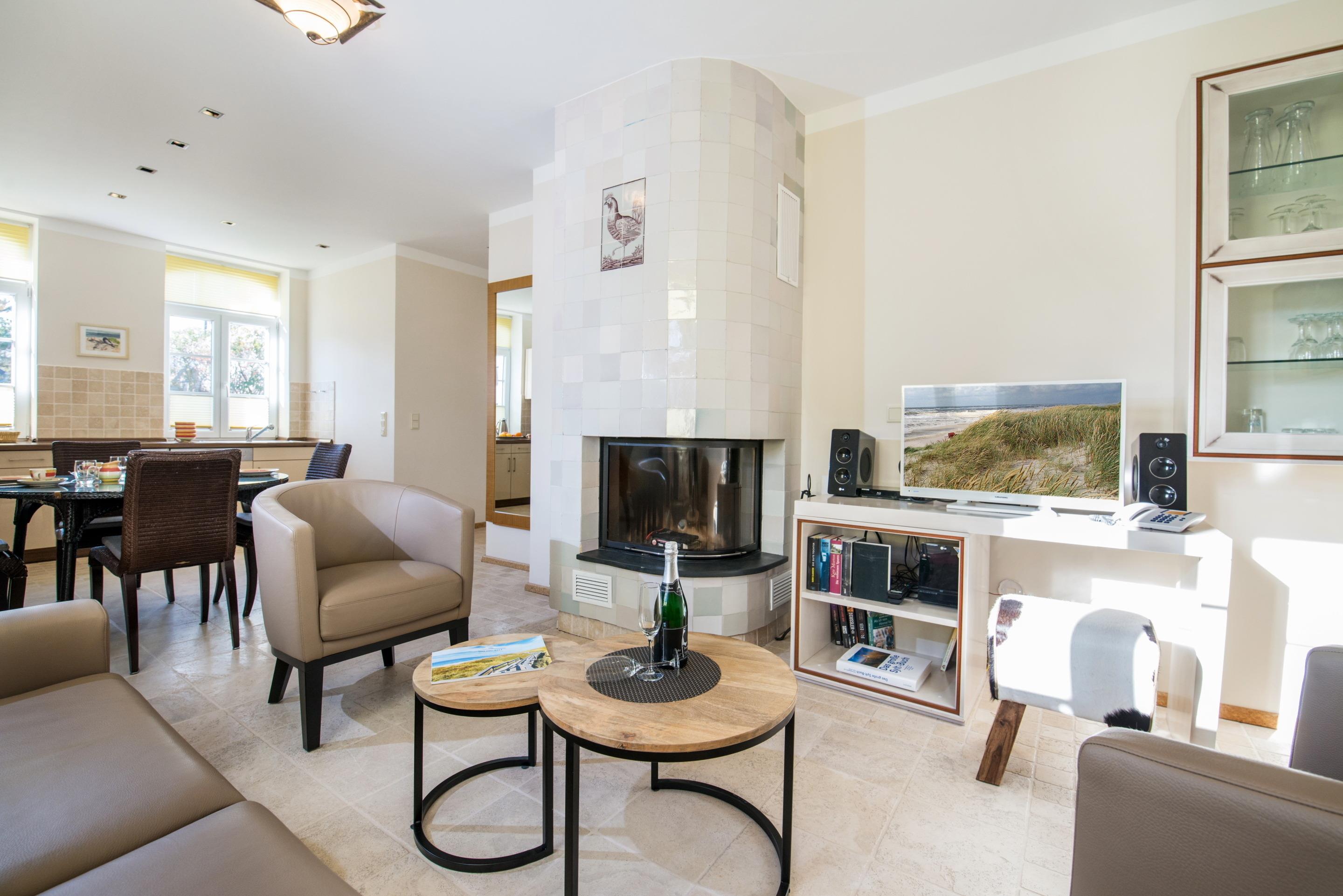 Exklusive Ferienwohnung in Westerland mit Kamin, Sonnenterrasse und Strandkorb, nur 5 Gehminuten vom Strand und Zentrum entfernt.
