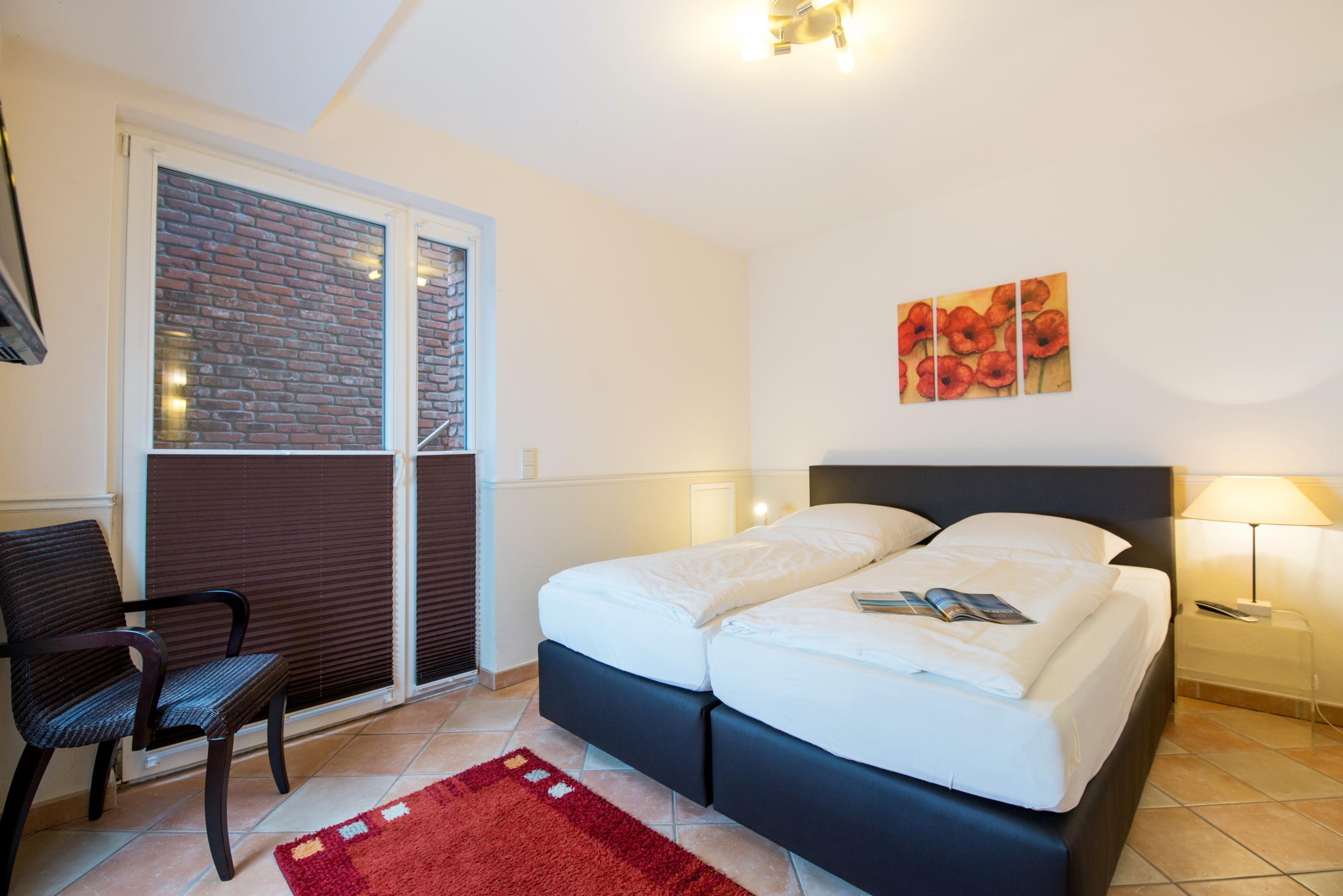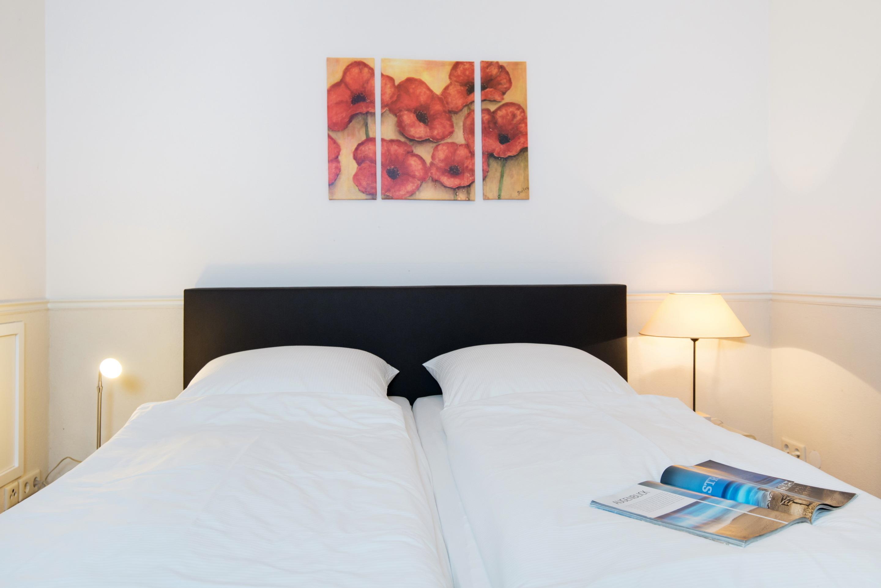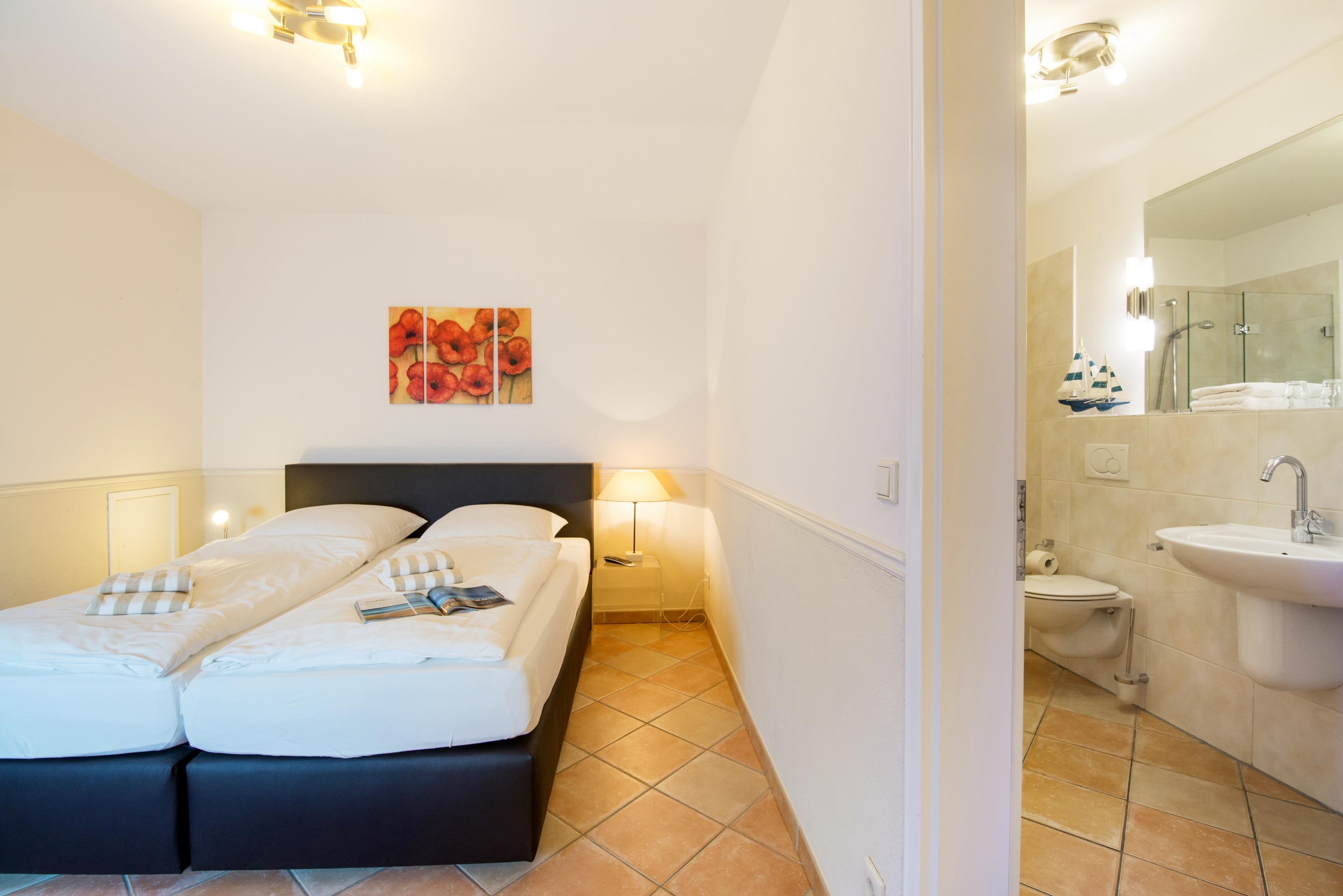 Das 1. geräumige Schlafzimmer mit einem guten Doppelbett (Maß 2x 0,90 x 2 Meter, mit zwei Einzelmatratzen) und ein schickes Bad mit Wanne, Dusche, WC und[nbsp][nbsp]Föhn.