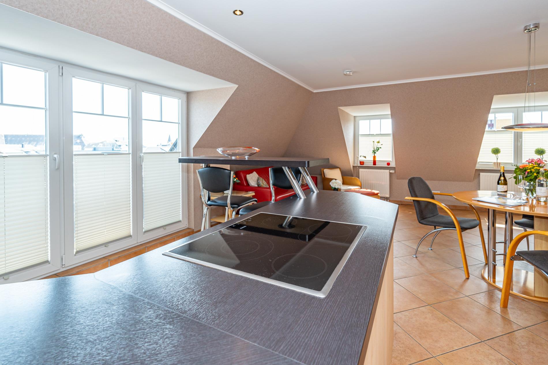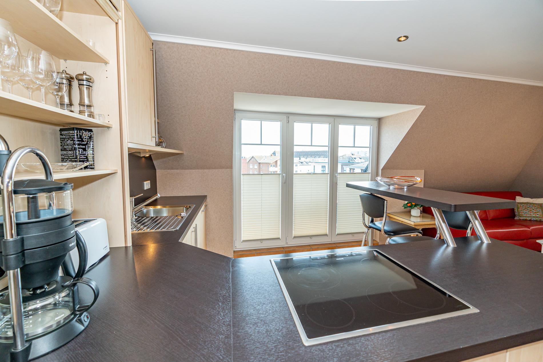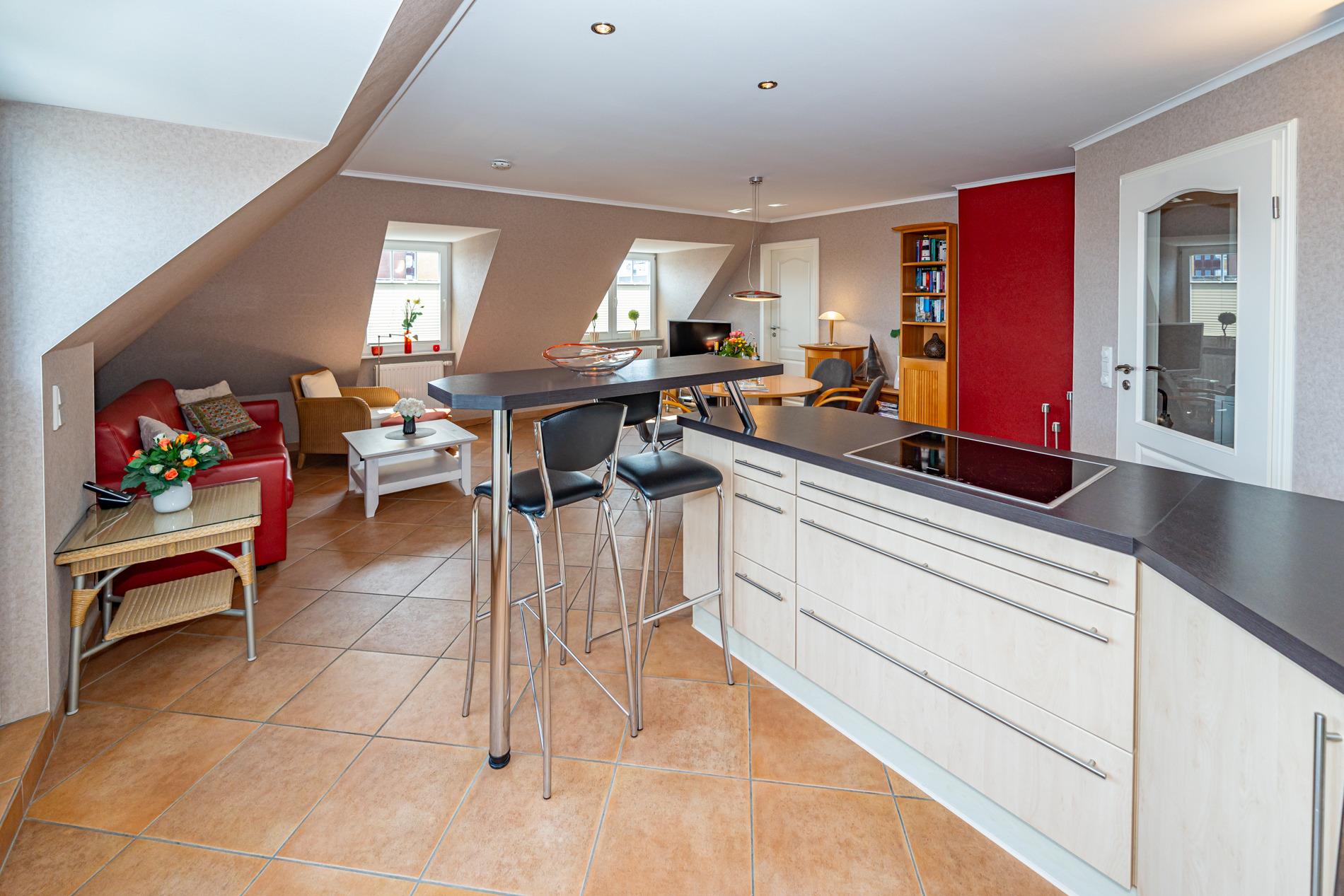 Die offene Wohnküche mit elegantem Tresen ist mit einem Geschirrspüler, einem 4-Platten-Cerankochfeld und einem Kühlschrank mit 3-Sterne-Gefrierfach, Eierkocher und Smoothie-to-go-Mixer ausgestattet.