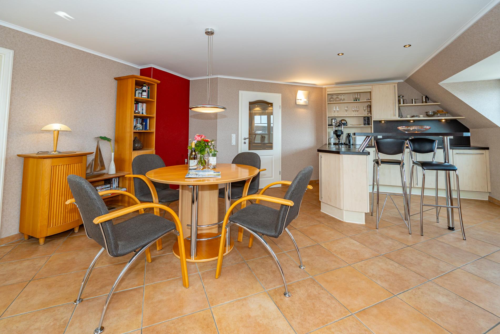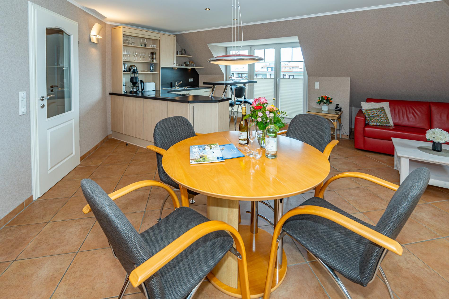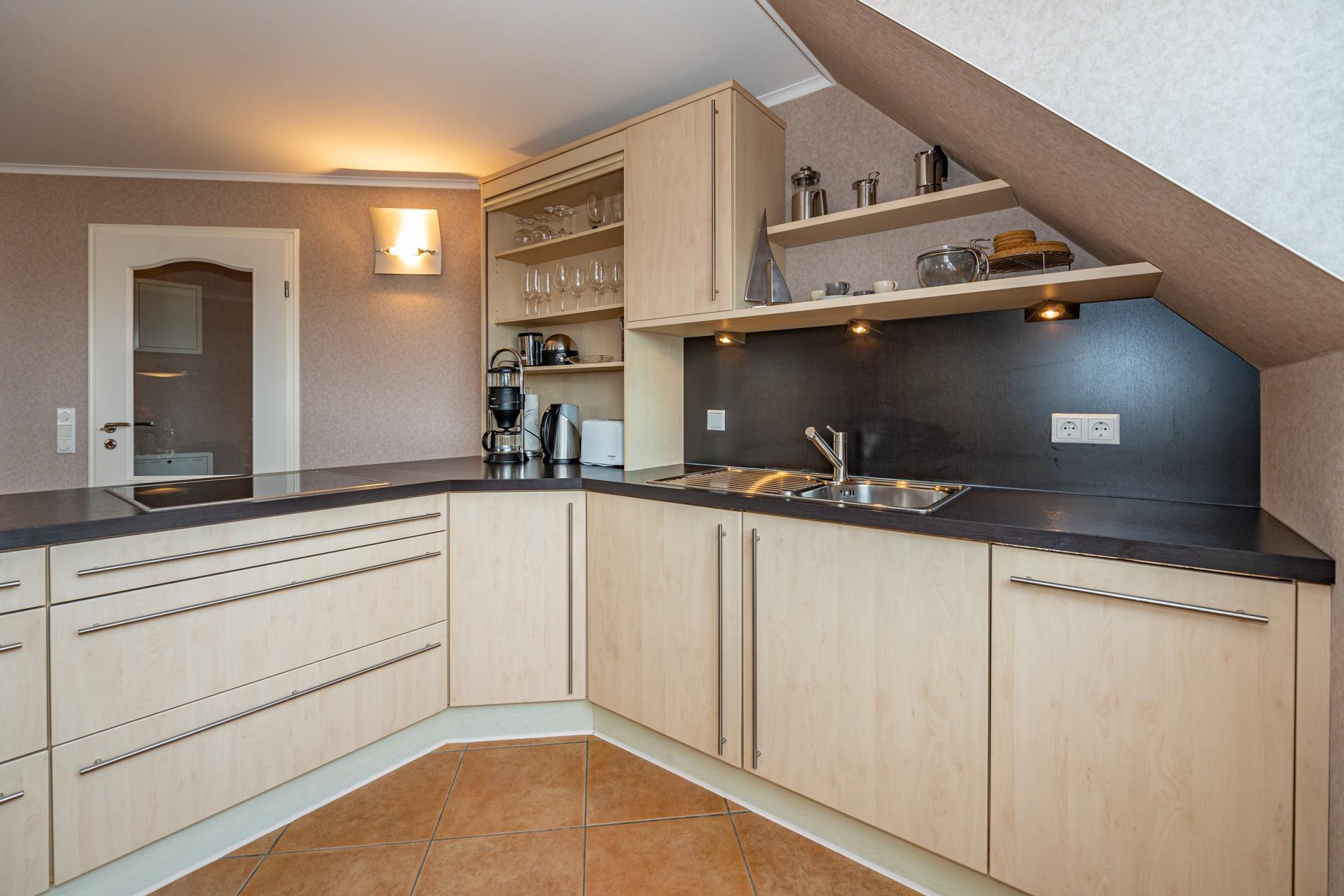Die offene Wohnküche mit elegantem Tresen ist mit einem Geschirrspüler, einem 4-Platten-Cerankochfeld und einem Kühlschrank mit 3-Sterne-Gefrierfach, Eierkocher und Smoothie-to-go-Mixer ausgestattet.