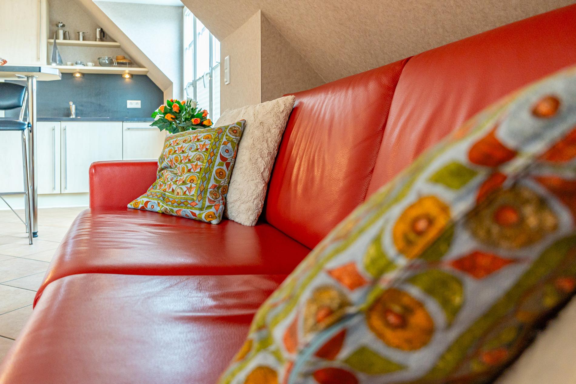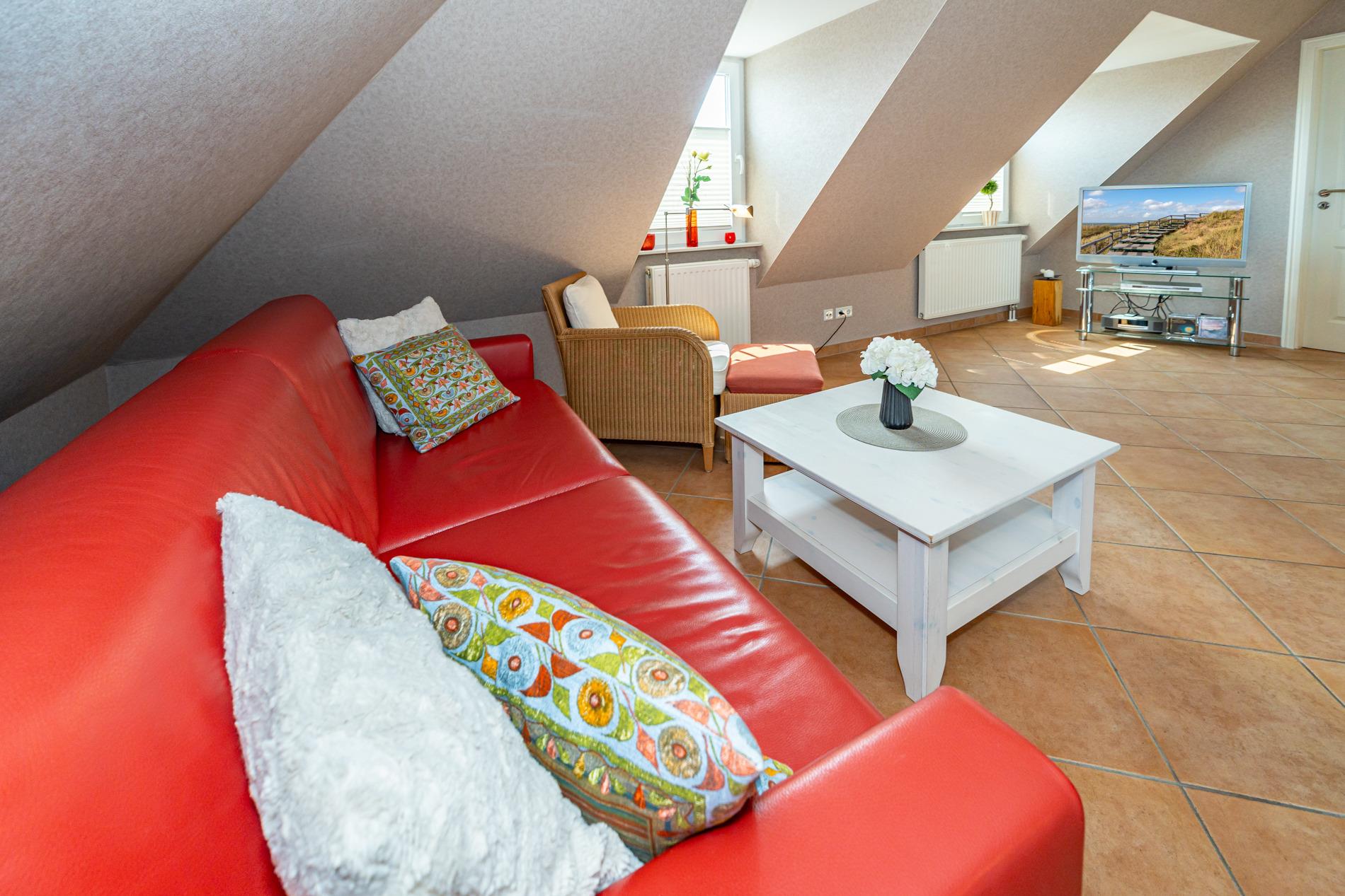 Der Wohnraum besteht aus einer hochwertigen Sitzgarnitur (2-Sitzer-Doppelschlafcouch 1,60 x 2,00 m und ein Sessel), einem gemütlichen Essplatz, einem Kabel-Flachbild-TV, Stereoanlage, DVD-Recorder, Telefon mit Wlan (ohne Gewähr) und kostenloser Telefonflatrate ins Deutsche Festnetz.