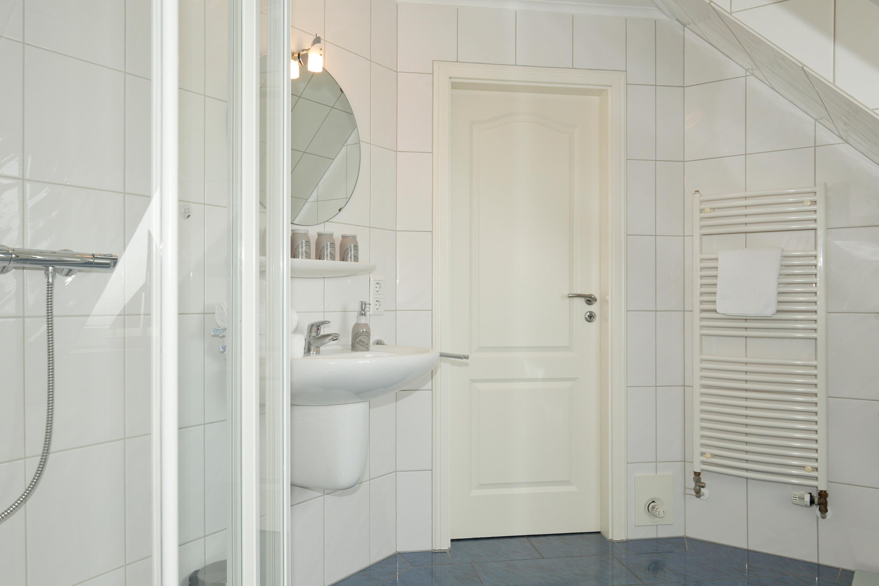 Das großzügige, neue Duschbad/WC hat einen Waschtisch, einen Handtuchtrockner und einen Fön.
