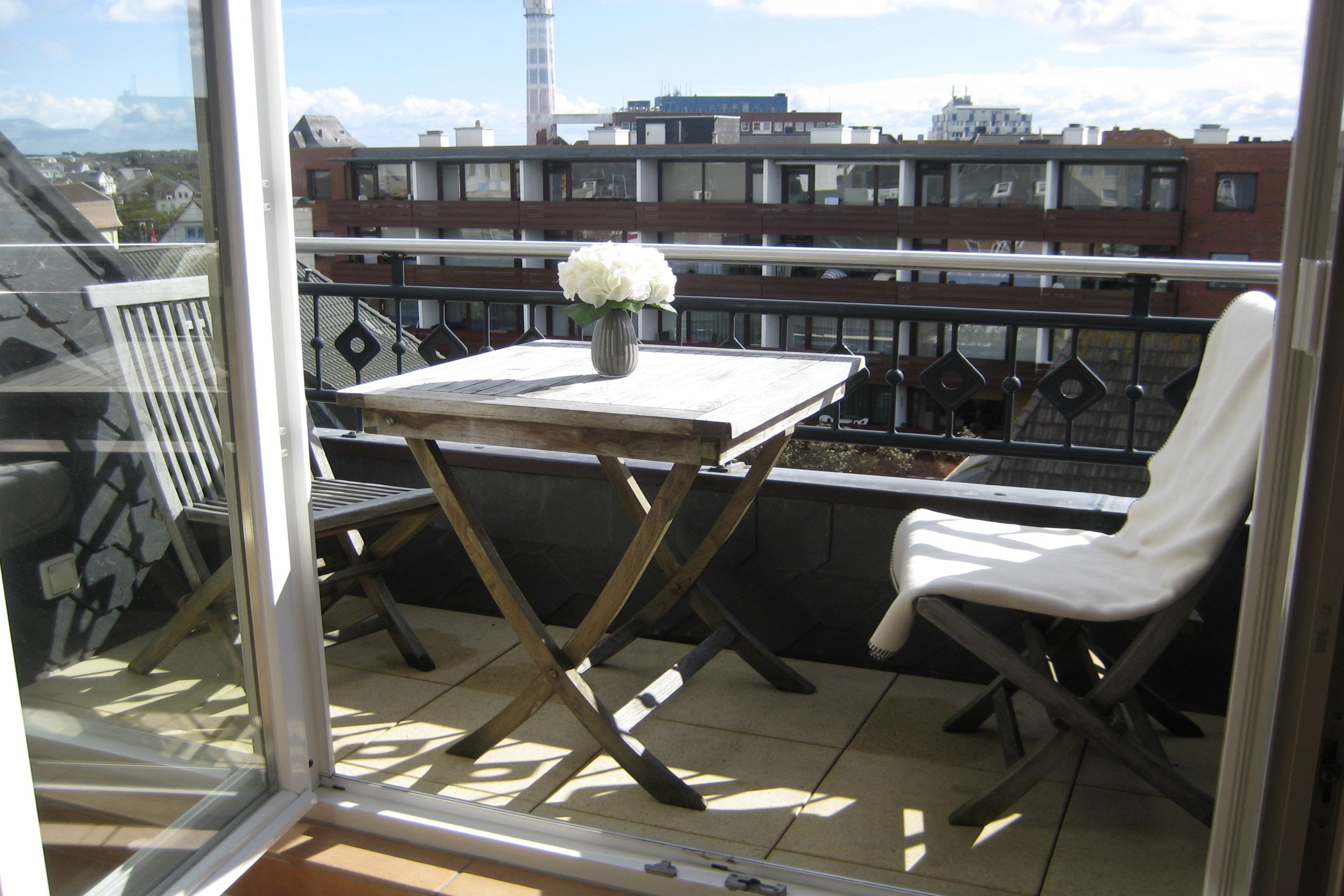 Diese exklusive 2-Zimmer-Nichtraucher-Ferienwohnung (ca. 64 qm) für max. 4 Personen befindet sich als einzige Wohnung in der obersten, 4. Etage (mit Fahrstuhl) des Hauses. Die Ferienwohnung hat einen Ostbalkon (Morgensonne) mit Balkonmöbeln aus Teakholz und Auflagen.