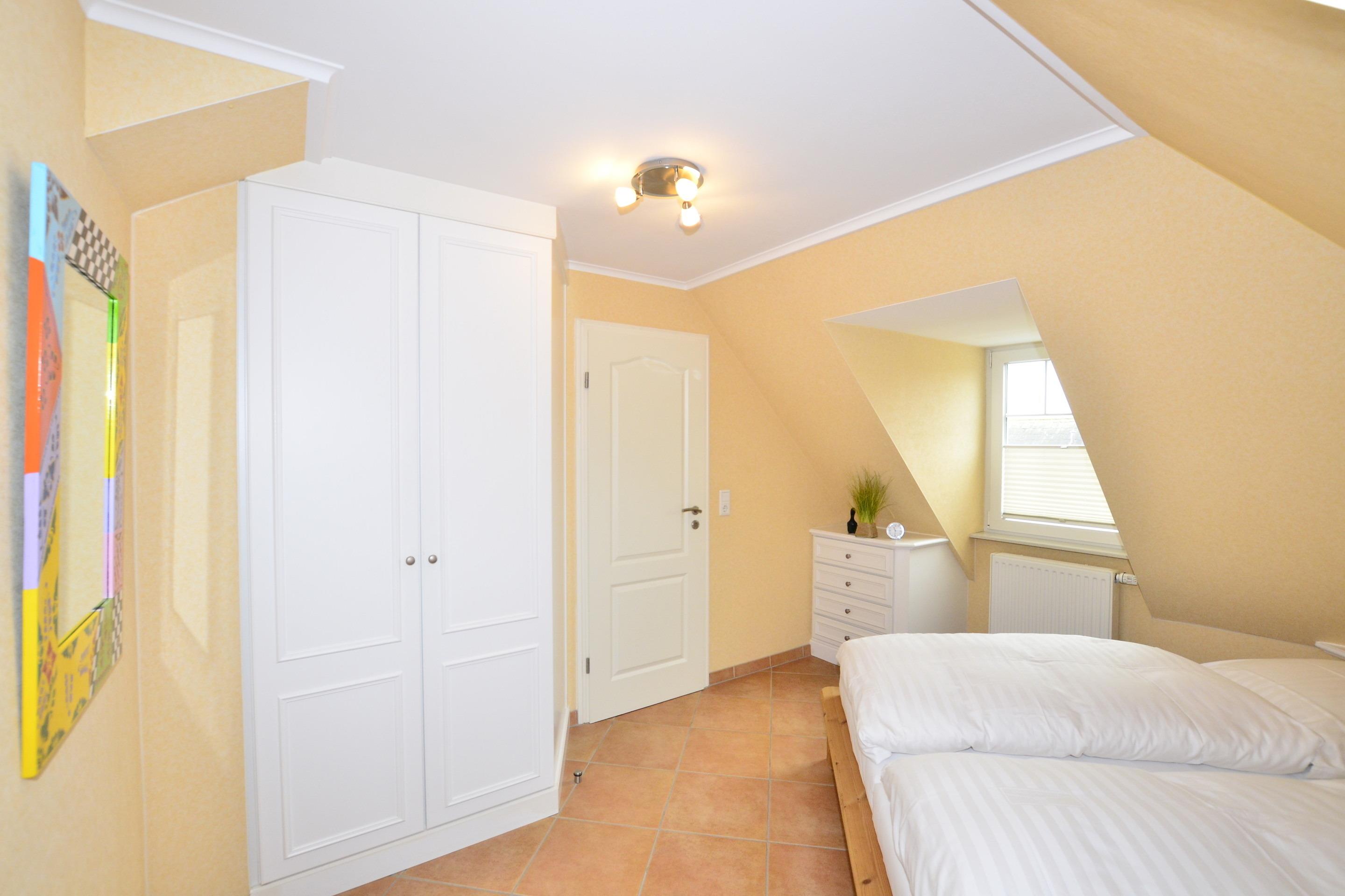 Das behagliche Schlafzimmer mit gutem Doppelbett ( mit Einzelmatratzen) und hochwertigen Einbauschränken wird vom Wohnraum aus betreten.