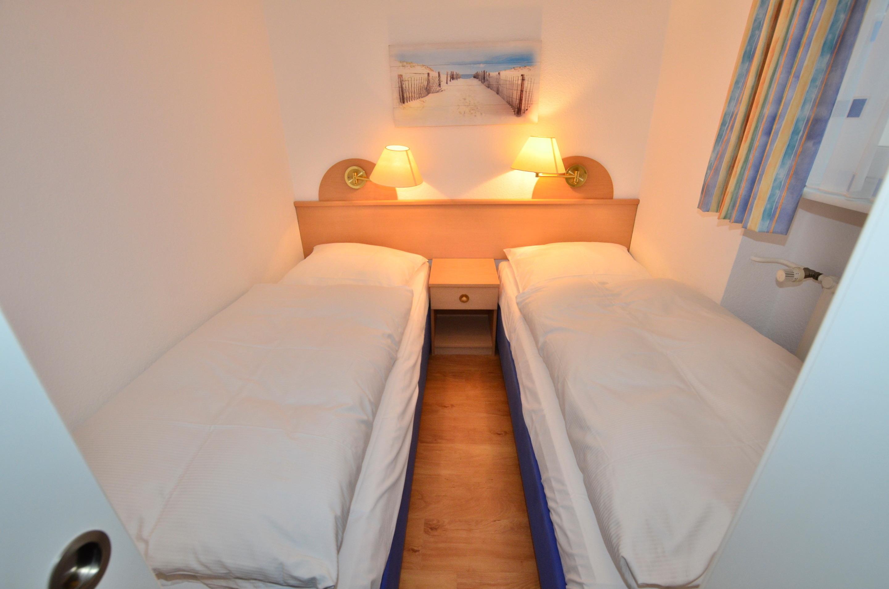 Das mit neuem PVC-Boden ausgelegte Schlafzimmer hat zwei auseinander stehende Einzelbetten (je 0,80 x 2,00 m, können nicht zusammen geschoben werden).