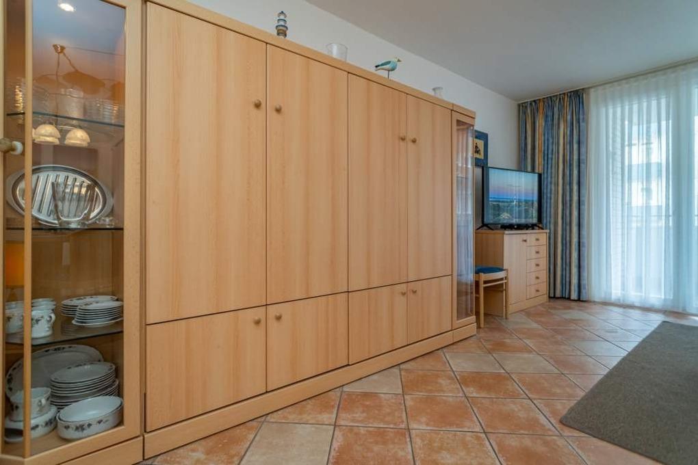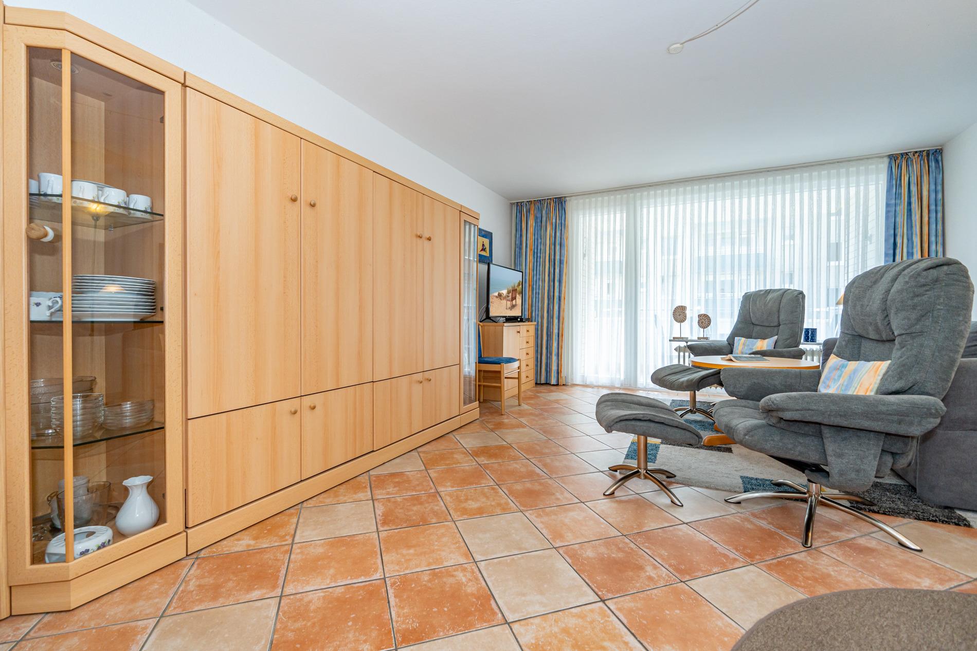 Der Wohnraum besteht aus einer bequemen Sitzgarnitur (2-Sitzer-Couch, 2 Sessel), einem Essplatz, einem Doppelschrankbett (einzeln ausklappbar), Flachbild-TV (HD-Ready mit digitalem Empfang mit ca. 60-100 Radio- und Fernsehprogrammen), DVD-Player, Radio/CD, kostenlose Flatrate ins deutsche Festnetz, W-Lan.