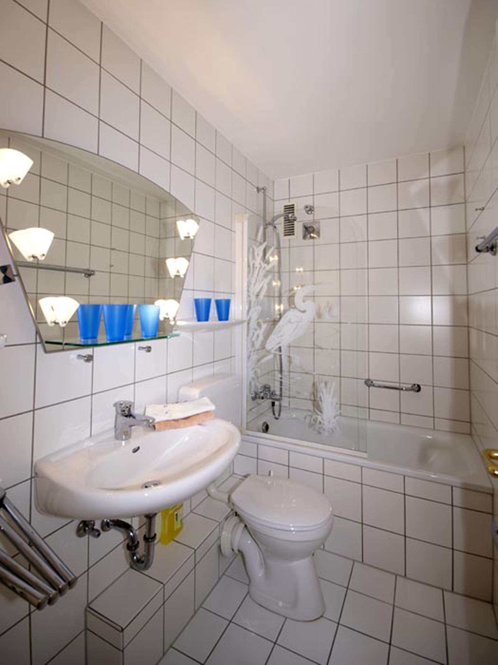 Im Bad befinden sich eine Wanne mit Duschvorrichtung, ein WC, ein Waschtisch und ein Fön.