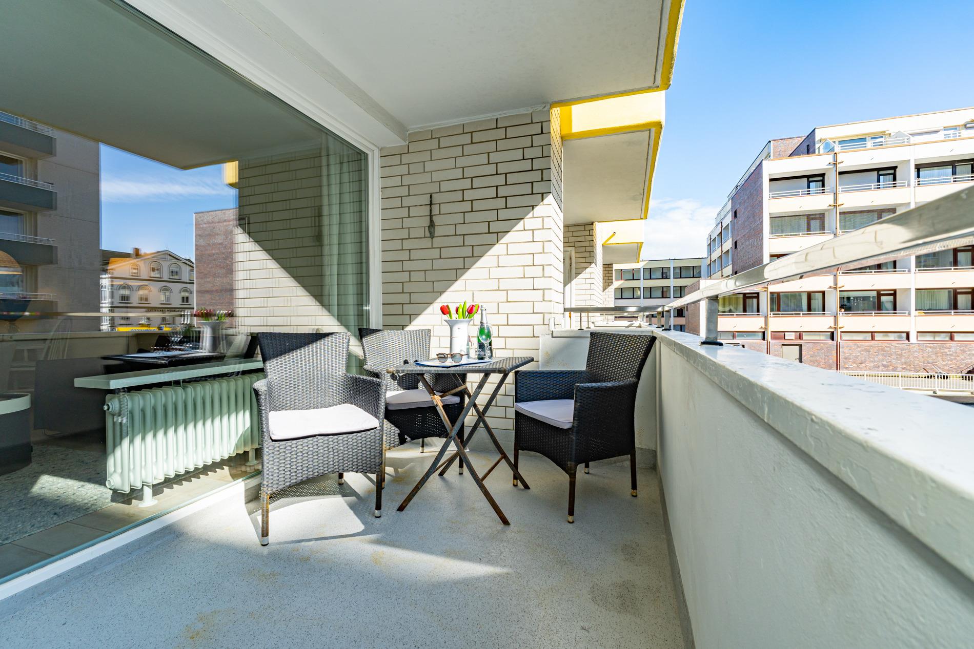 Der möblierte Südbalkon lädt zum Entspannen in der Sonne ein. Sitzauflagen für bis zu drei Personen sind vorhanden und befinden sich entweder auf dem Balkon oder im kleinen, vom Balkon aus zugänglichen Abstellraum. Ein PKW-Außenstellplatz kann auf Wunsch für 14,00?€ pro Tag dazugebucht werden – bitte beachten Sie, dass nur ein begrenztes Kontingent zur Verfügung steht.