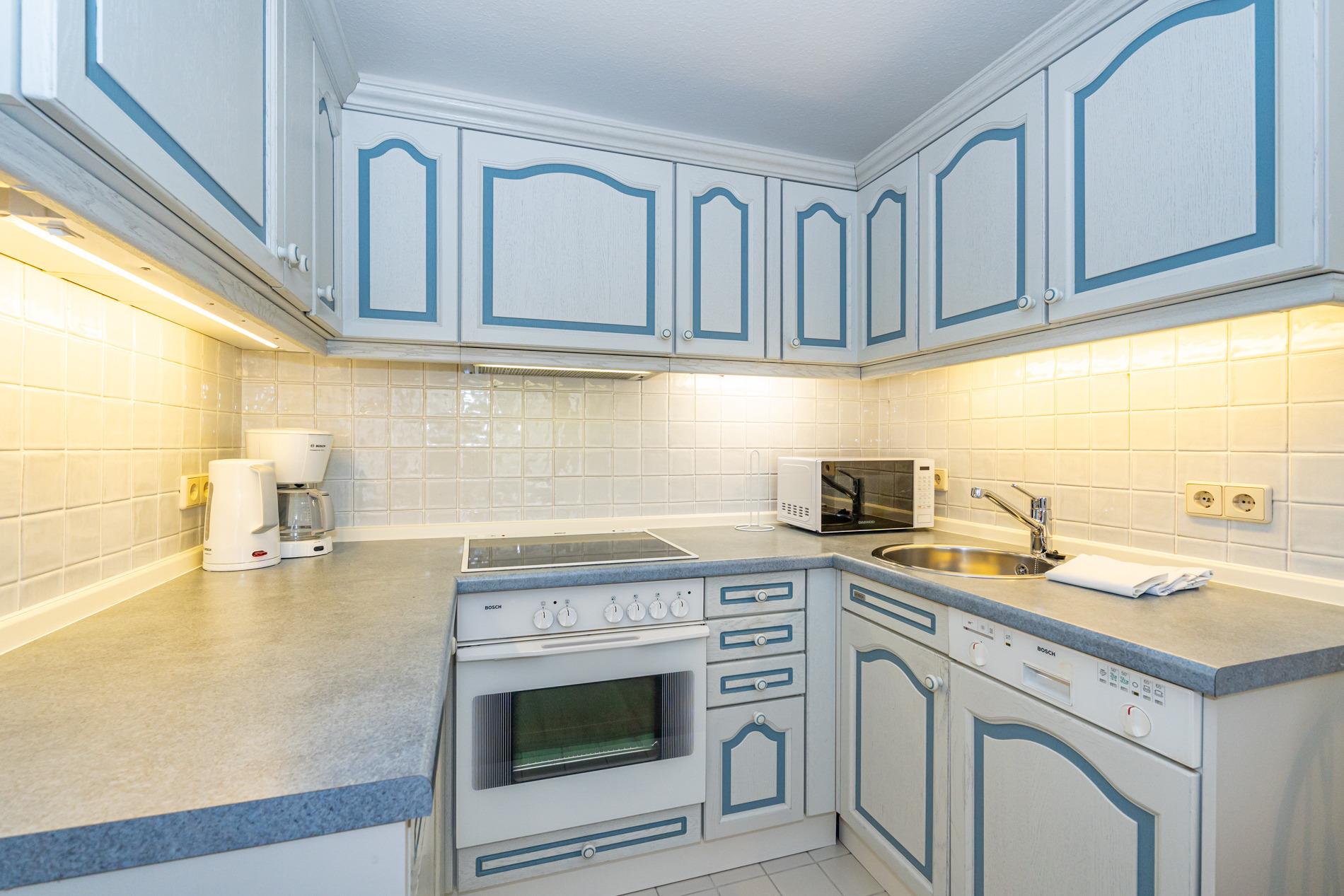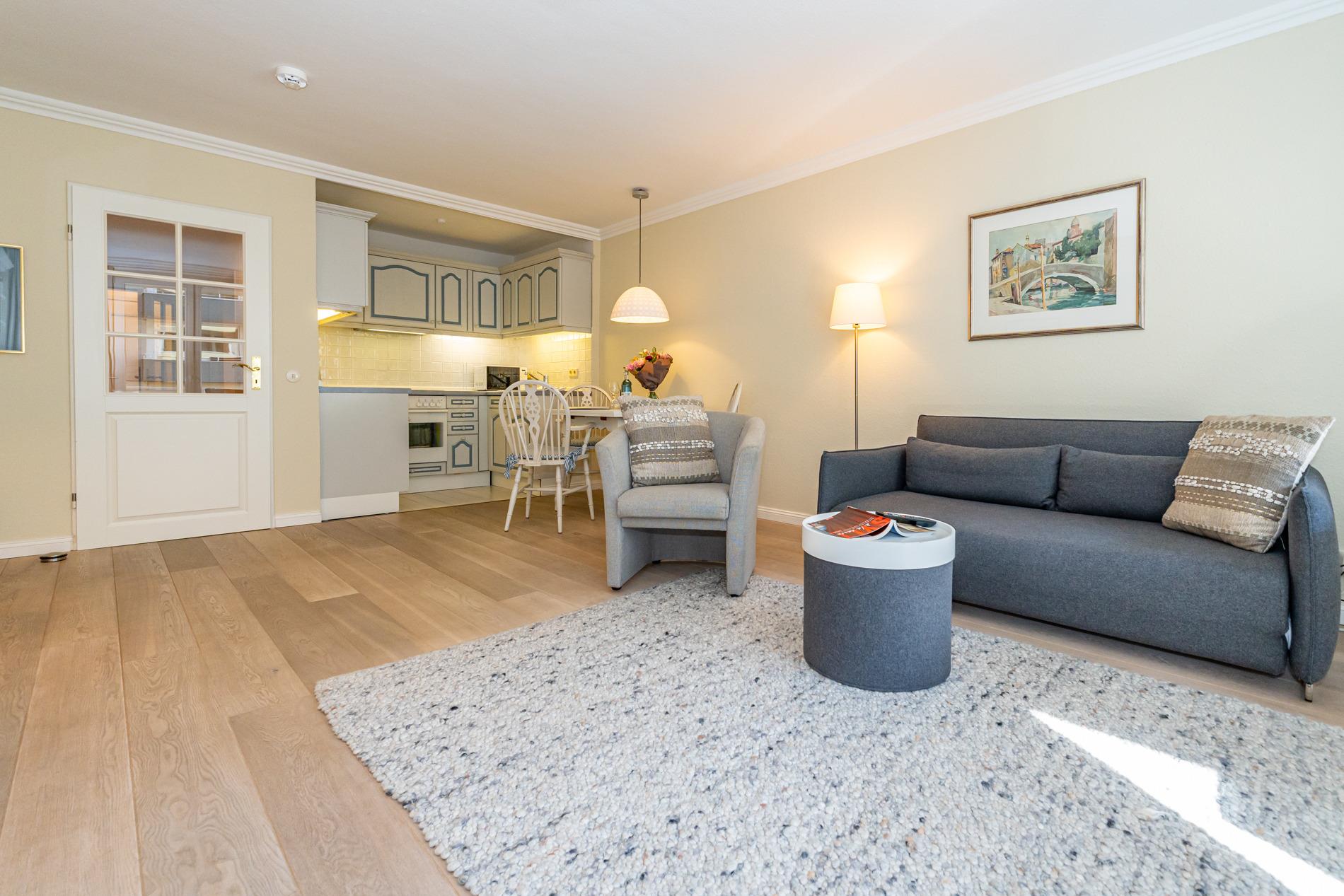 Der Wohnbereich ist mit einem hochwertigen Echtholzboden versehen und verfügt über eine gemütliche 2-Sitzer-Schlafcouch (Liegefläche ca. 1,50?m x 2,00?m), einen Sessel, einen flexibel nutzbaren Beistelltisch mit abnehmbarem Tablett (auch als Hocker verwendbar), einen Essplatz, SAT-TV und einen Bluetooth-Lautsprecher. Die offene Küchenzeile bietet alles, was Sie für einen angenehmen Aufenthalt benötigen: ein 4-Platten-Cerankochfeld, Backofen, Mikrowelle, Geschirrspüler sowie einen Kühlschrank mit 3*-Gefrierfach. Kaffeemaschine, Wasserkocher und Toaster gehören selbstverständlich zur Grundausstattung.