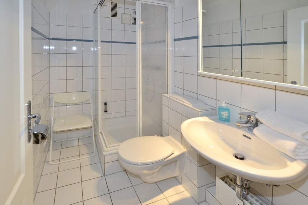 Im Bad befinden sich eine Dusche, ein WC und ein Waschtisch.
