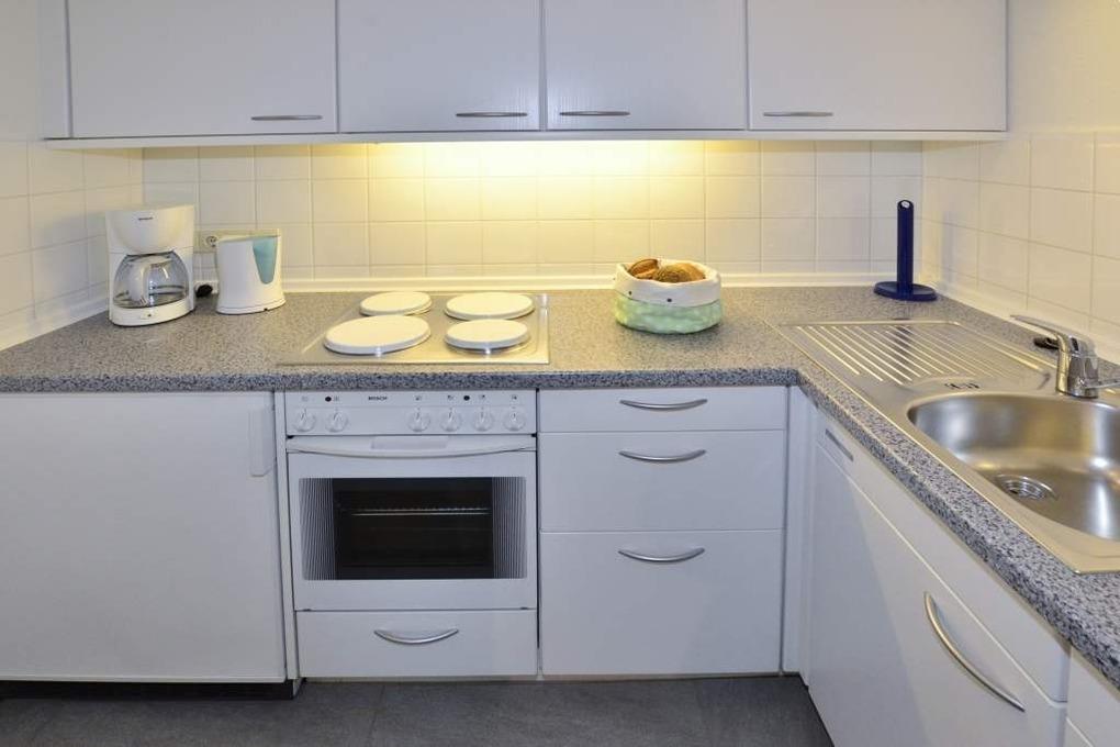 Die zum Wohnraum geöffnete Küche hat einen 4-Plattenherd mit Backofen. Kaffeemaschine, Wasserkocher und Toaster gehören zur Grundausstattung.