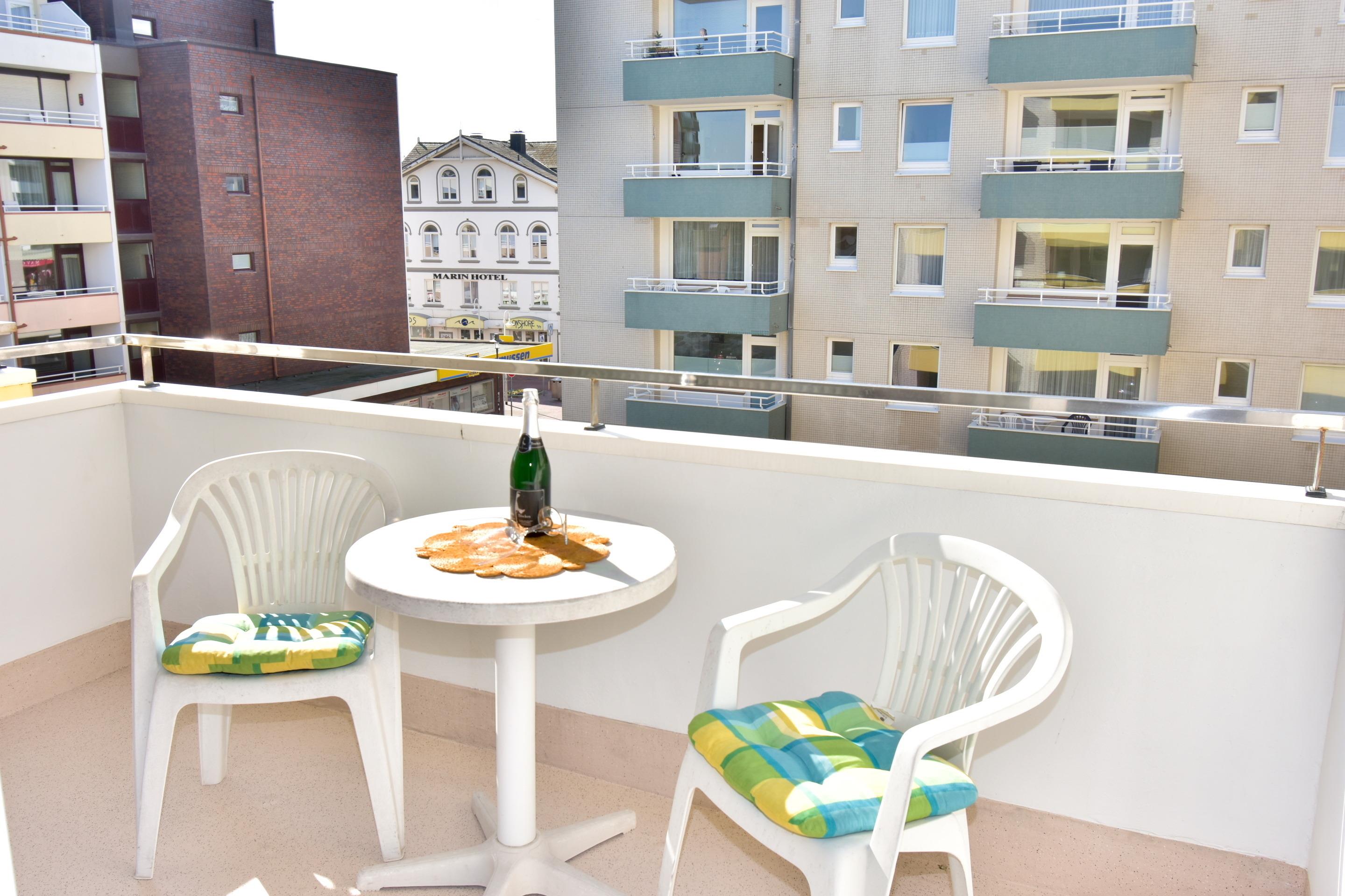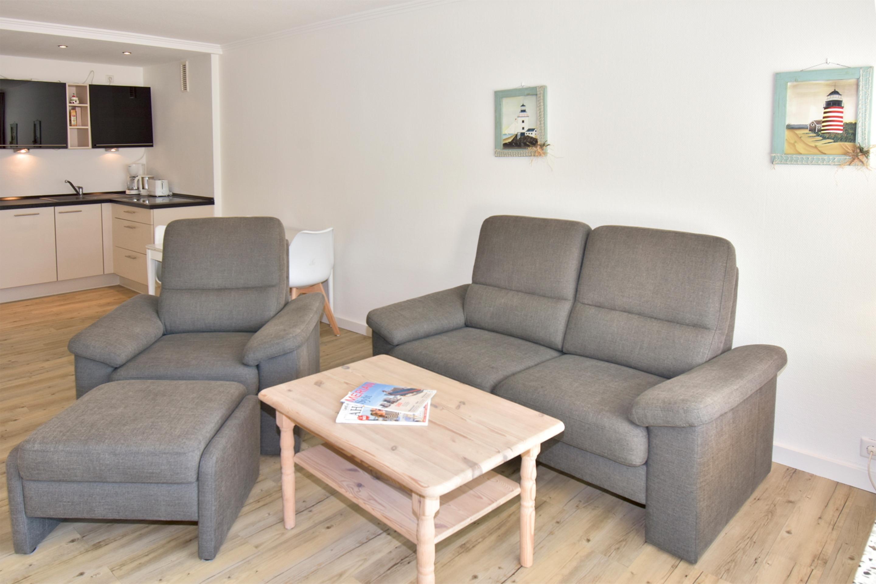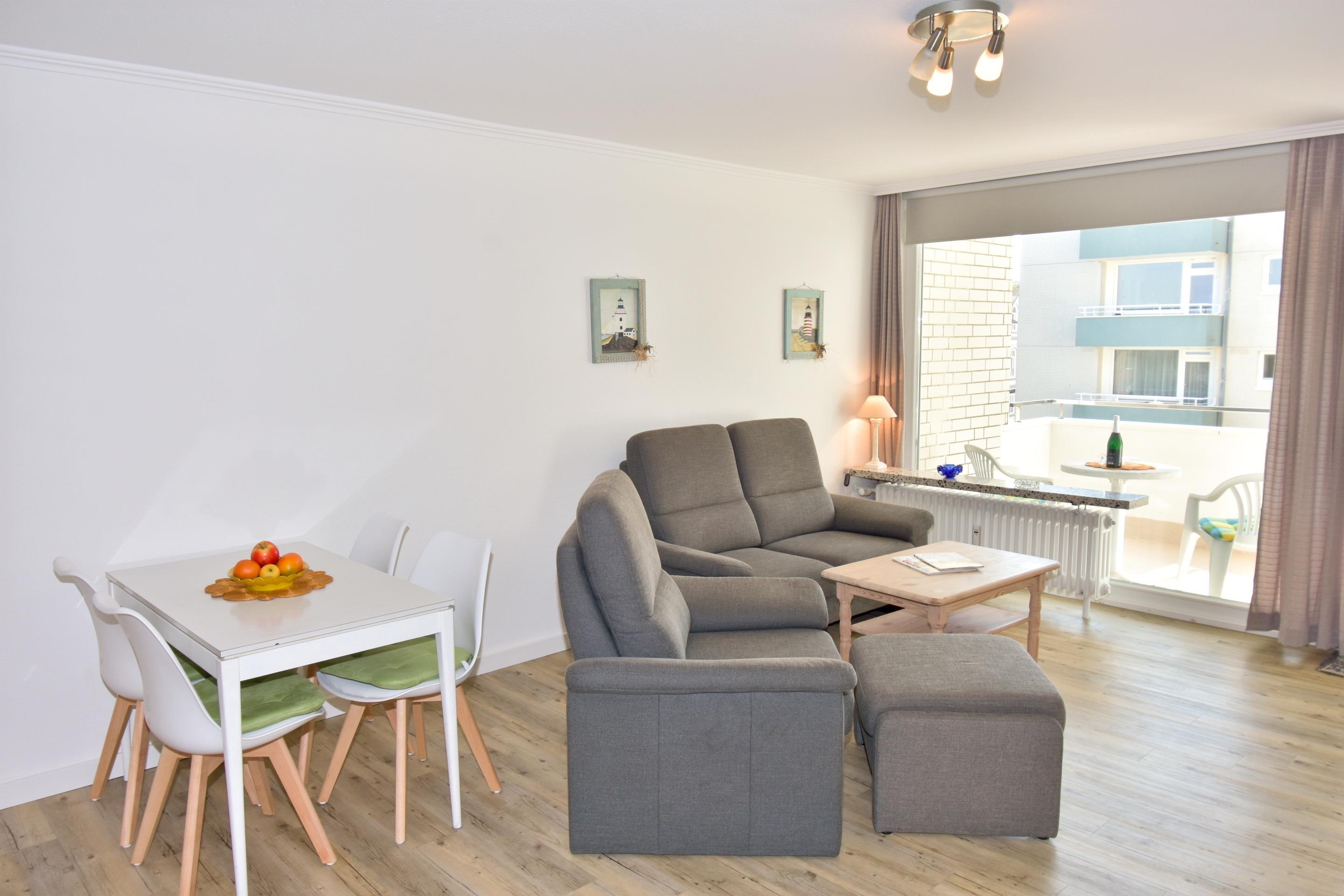 Im Wohnzimmer erwarten Sie eine gemütliche Sitzecke mit 2-Sitzer-Sofa und Sessel, ein Essplatz sowie ein bequemes Doppelschrankbett (ausklappbar, mit getrennten Matratzen). Für Unterhaltung sorgen Sat-TV und Radio. Der angrenzende Südbalkon lädt mit bequemen Balkonmöbeln und Auflagen zu sonnigen Stunden ein.