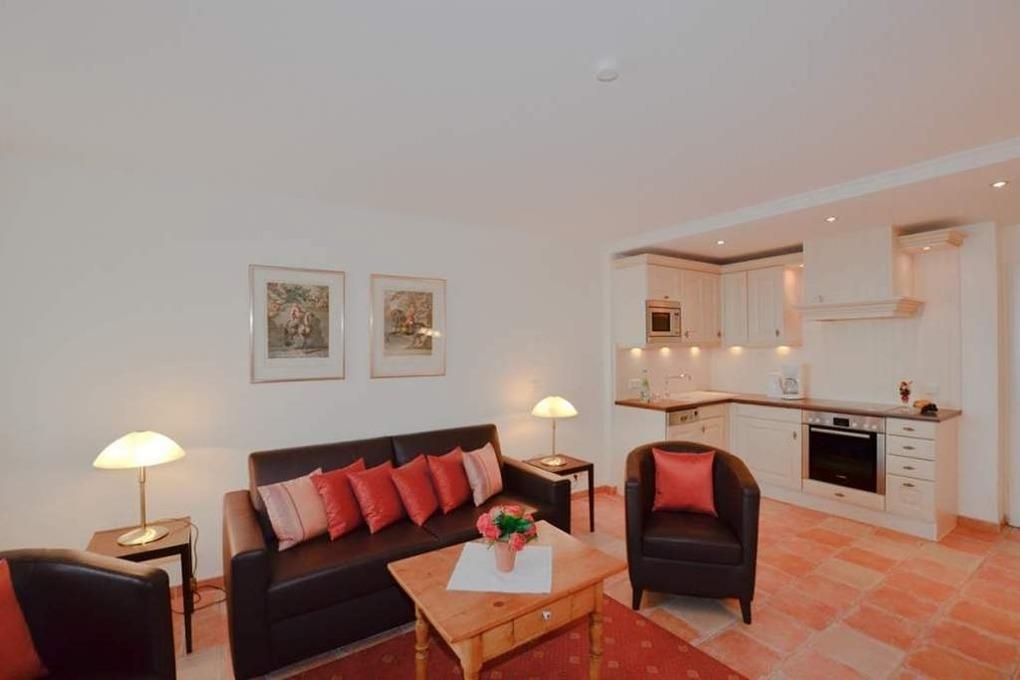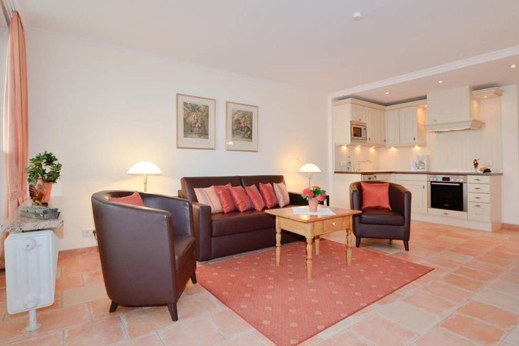 Der Wohnraum besteht aus einer hochwertigen Sitzgarnitur von Bielefelder Werkstätten mit Schlafcouch (Liegefläche 1,60 m breit in optimaler Liegehöhe) und zwei Sesseln, einem Essplatz, Flachbild-TV HD-Ready mit digitalem Empfang mit ca. 60-100 Radio- und Fernsehprogrammen, HiFi-Anlage mit CD-Player, Telefon inklusive Flatrate für Gespräche ins deutsche Festnetz (Handynummern gesperrt), kostenloser Internetzugang per W-Lan (ohne Gewähr), und offener, neuer Pantryküche.