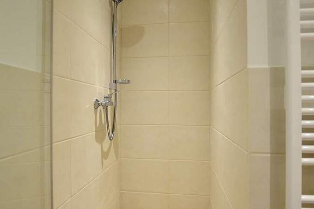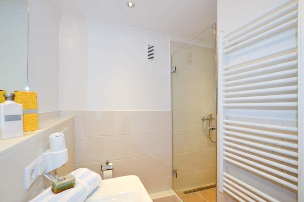 Im neuwertigen Bad befinden sich eine Dusche mit flachem Einstieg, ein WC, ein Waschtisch, ein Handtuchtrockner und ein Fön.
