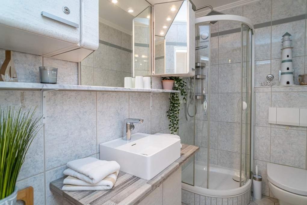 Im Bad befindet sich eine Dusche, ein WC und ein Waschtisch. Ein Fön ist vorhanden. Ein kleiner Tritt für die Kinder ist hier ebenfalls vorhanden.