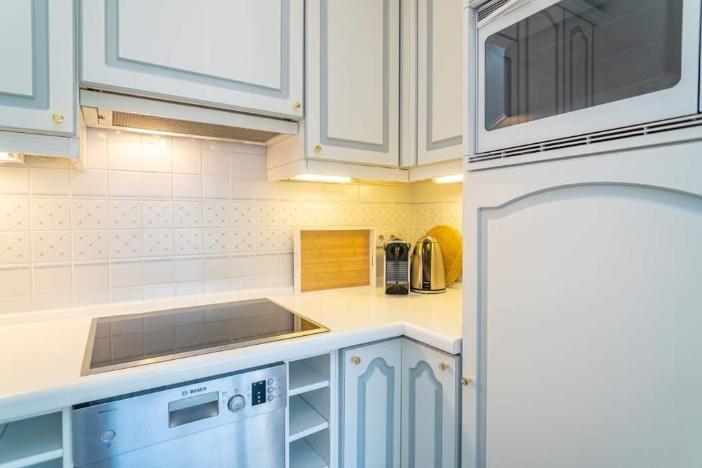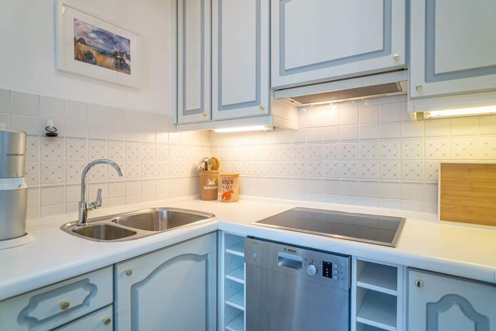 Die offene Küche hat einen Geschirrspüler, einen Induktionsherd, eine Mikrowelle/Backofen-Kombination, einen Kühlschrank, eine Nepresso-Maschine, sowie ein Handfilter aus Porzellan für Filterkaffee. Wasserkocher, Soda-Stream und Toaster gehören zur Grundausstattung. Selbst für die Kleinen ist Kindergeschirr und 2 TrippTrapp Kinderstühle sind vorhanden.