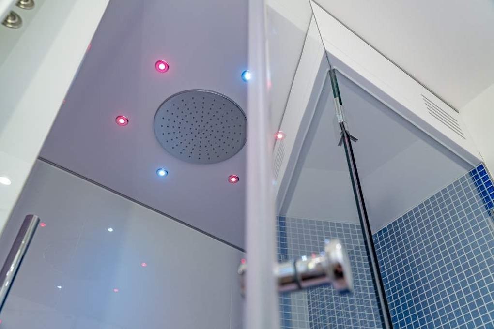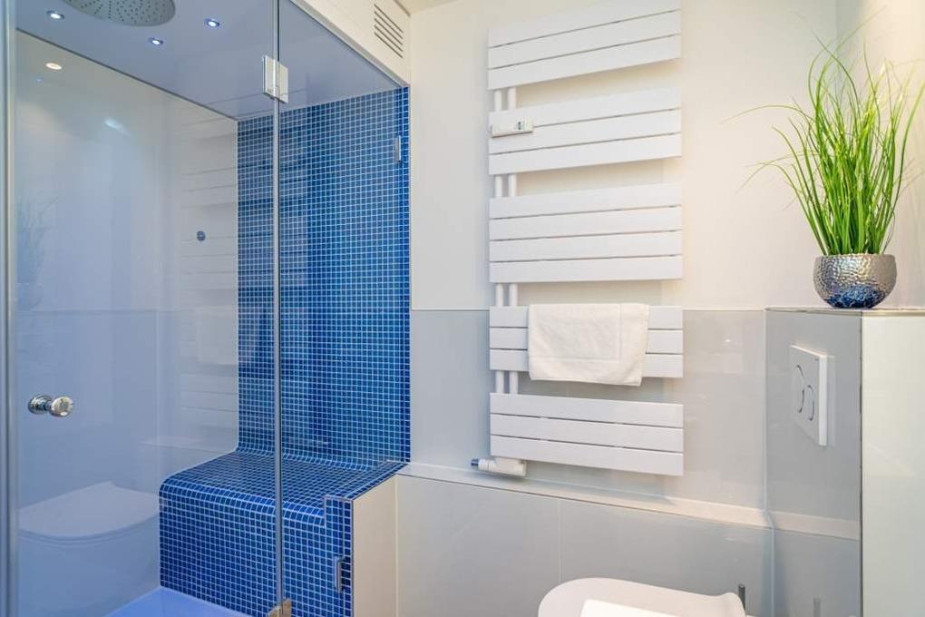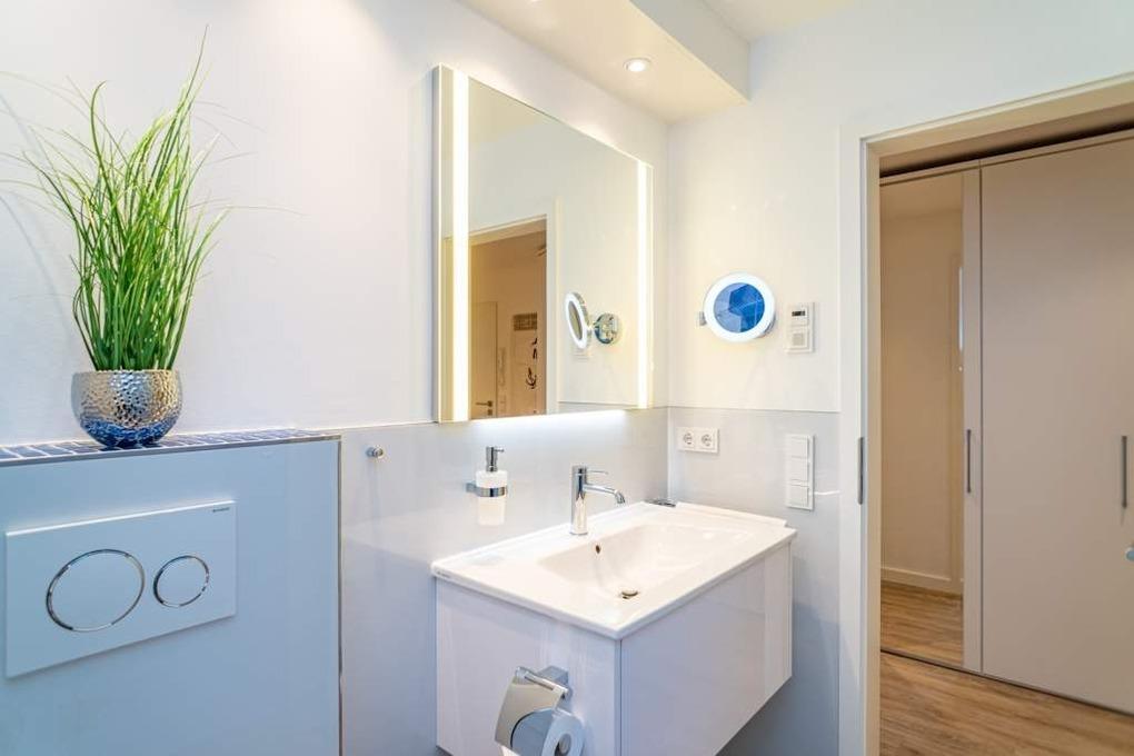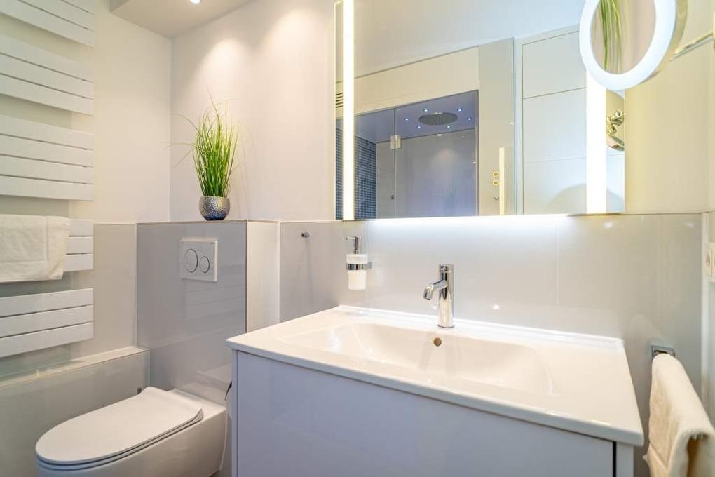 Das helle moderne Bad hat eine große Dusche mit extraflachem Einstieg, WC, Waschtisch, Handtuchheizkörper, Kosmetikspiegel und Fön.