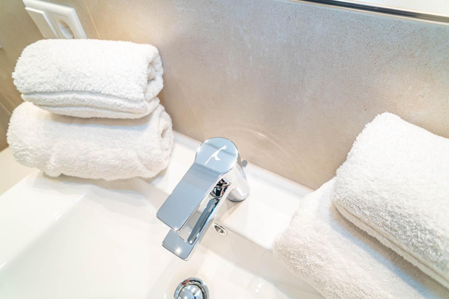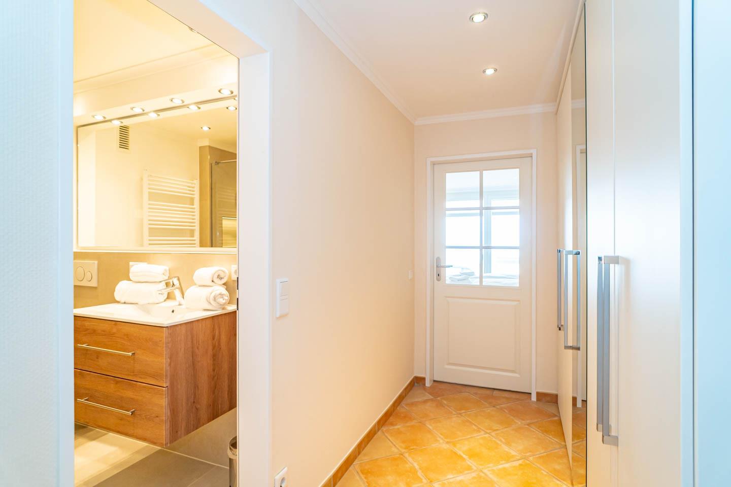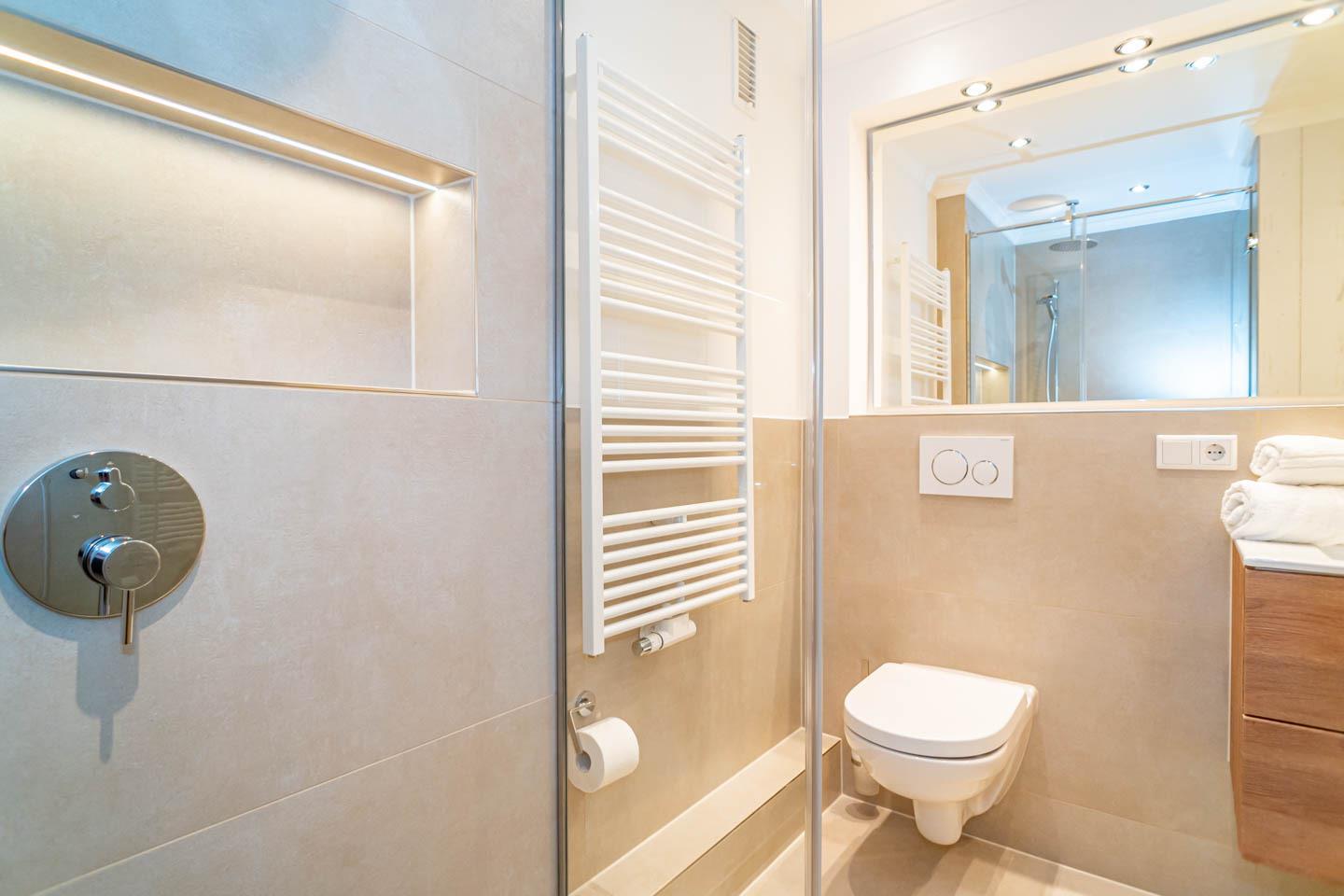 Im modernen Badezimmer erwartet Sie eine großzügige Dusche mit extraflachem Einstieg, ein Waschtisch, Handtuchtrockner, Fön und ein WC.