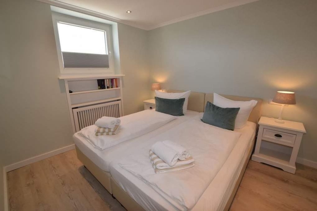 Das Schlafzimmer ist mit einem komfortablen Boxspring-Doppelbett (Liegefläche 1,80 x 2,00m, Einzelmatratzen) ausgestattet. Auf Wunsch kann das Bett in zwei Einzelbetten umgewandelt werden. Im neuen, großzügigen Badezimmer befinden sich eine Dusche mit extra flachem Einstieg, zusätzlich eine kleine Badewanne, ein Waschtisch, ein Handtuchtrockner, sowie WC.