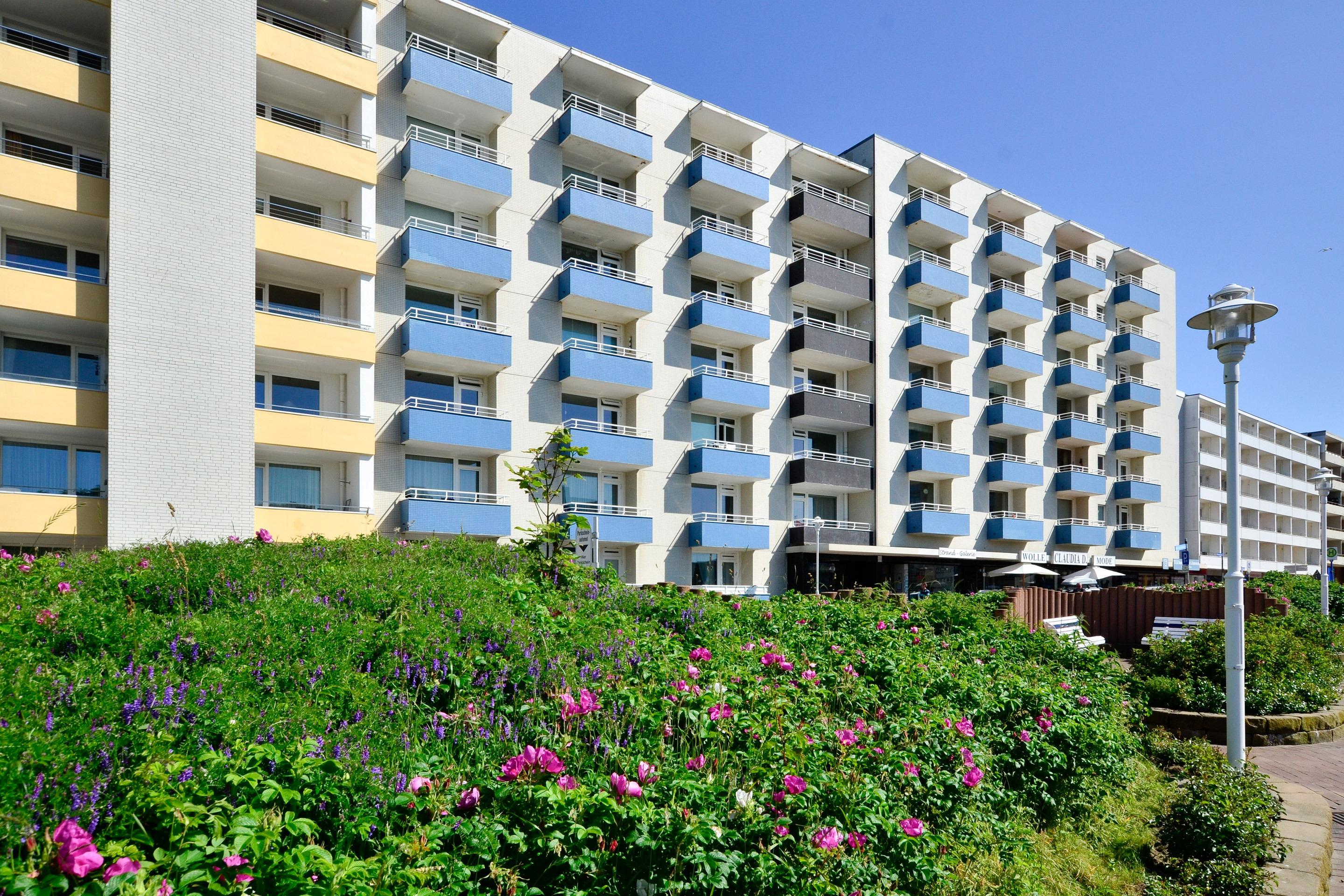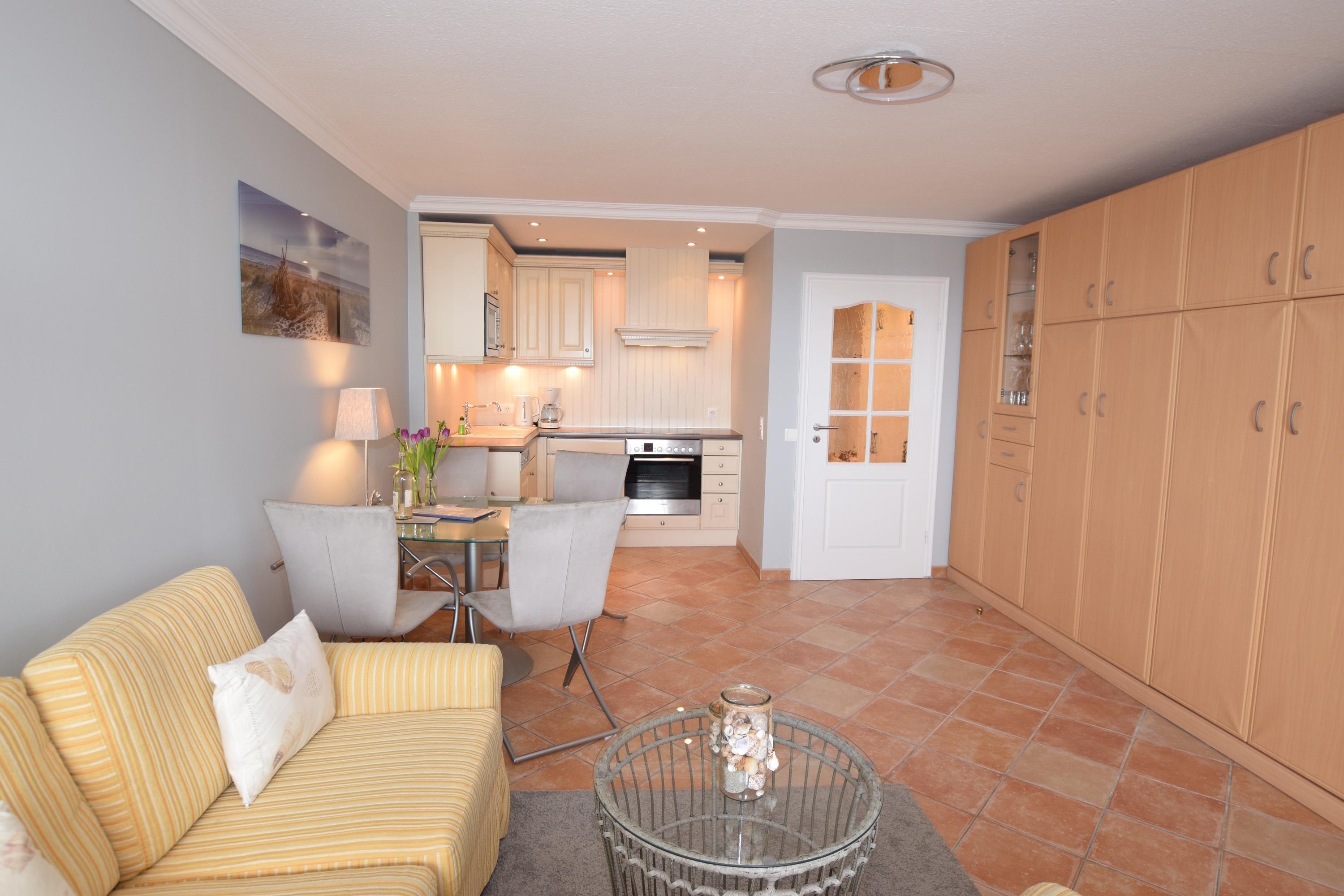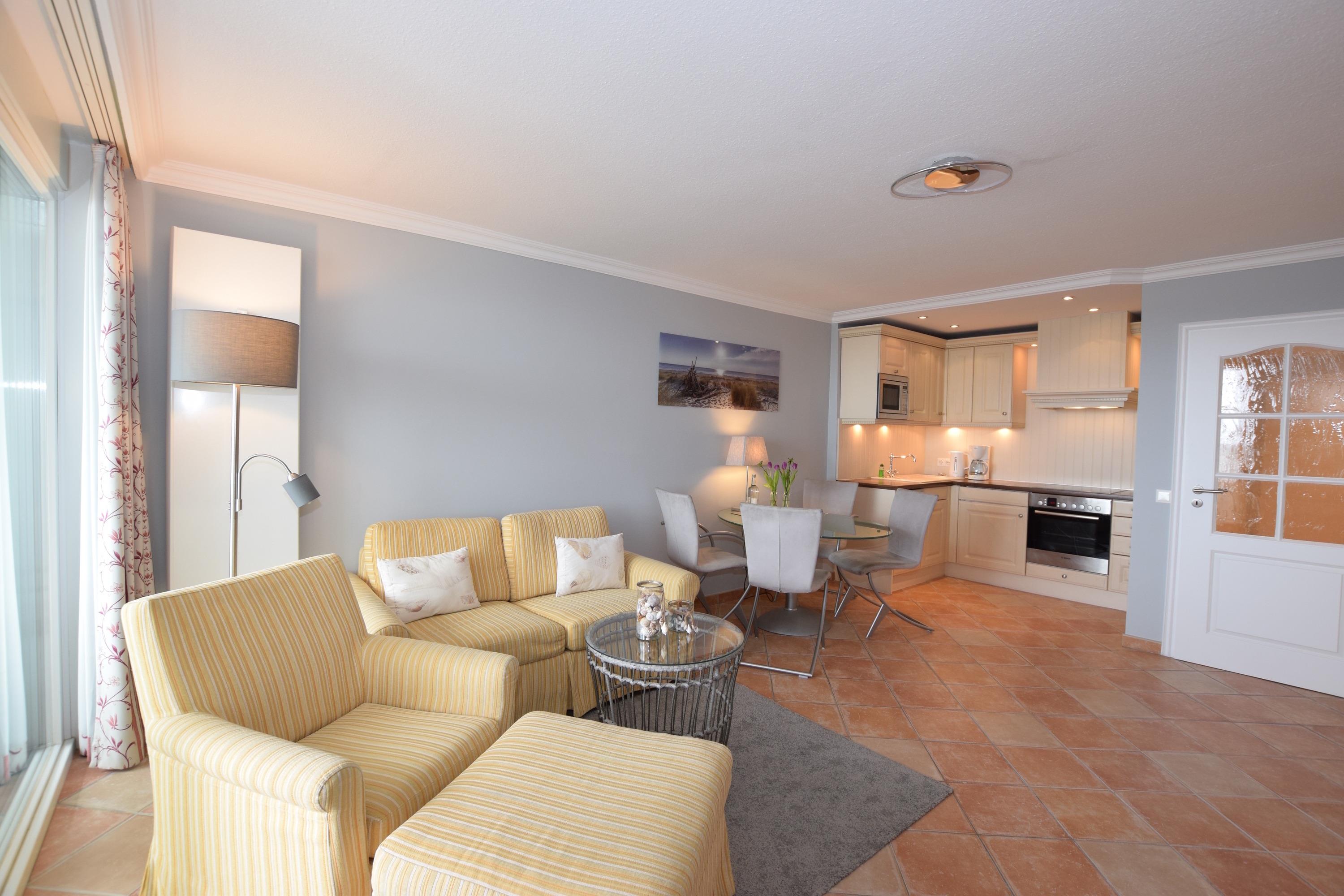 Schön eingerichtete 1,5-Zimmer-Nichtraucher-Ferienwohnung (ca. 48 qm) in der 6. Etage zur Seeseite mit herrlichem Meerblick und Westloggia (Nachmittagssonne, mit Balkonmöbeln und Auflagen) für max. 4 Personen.