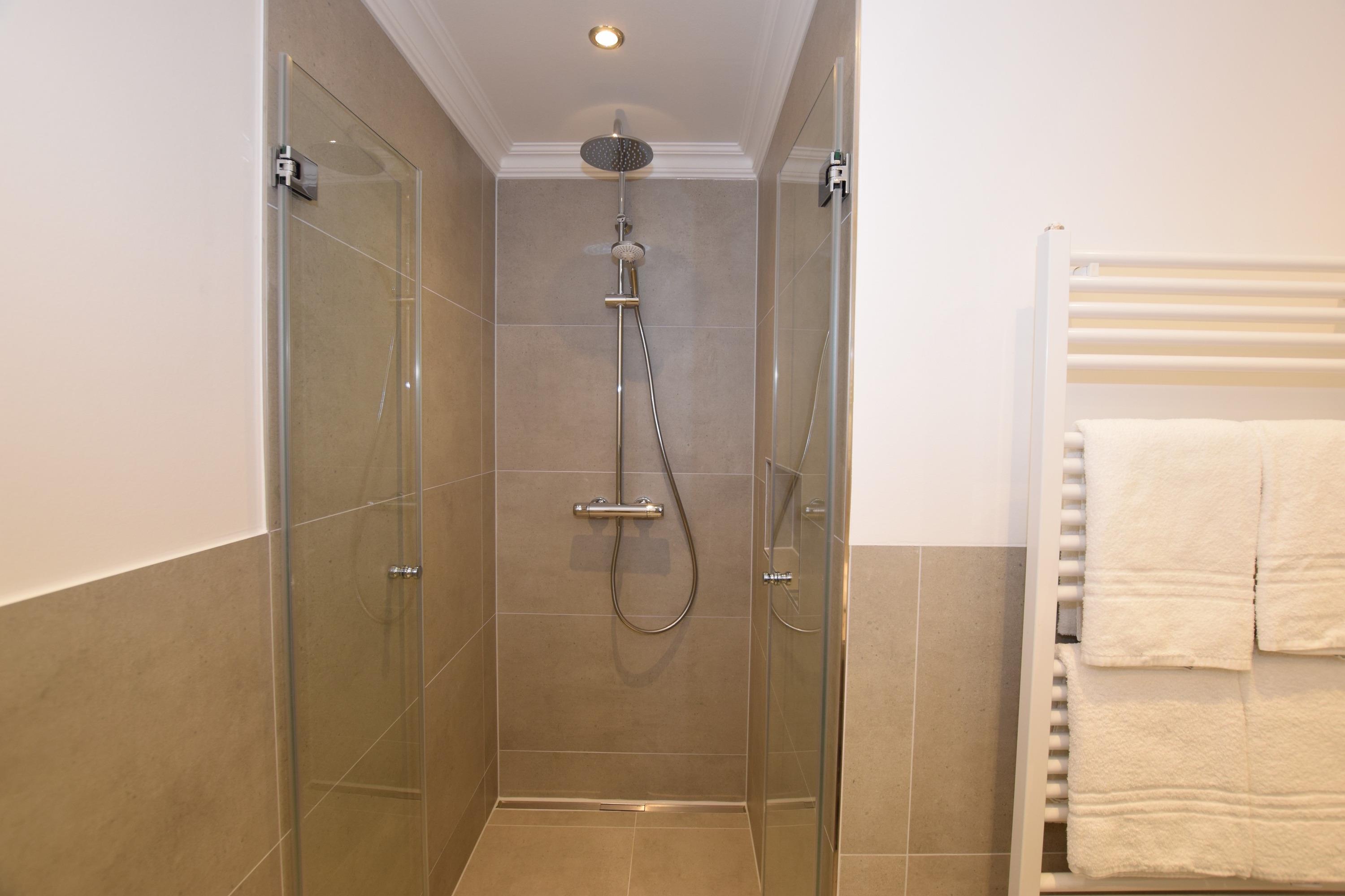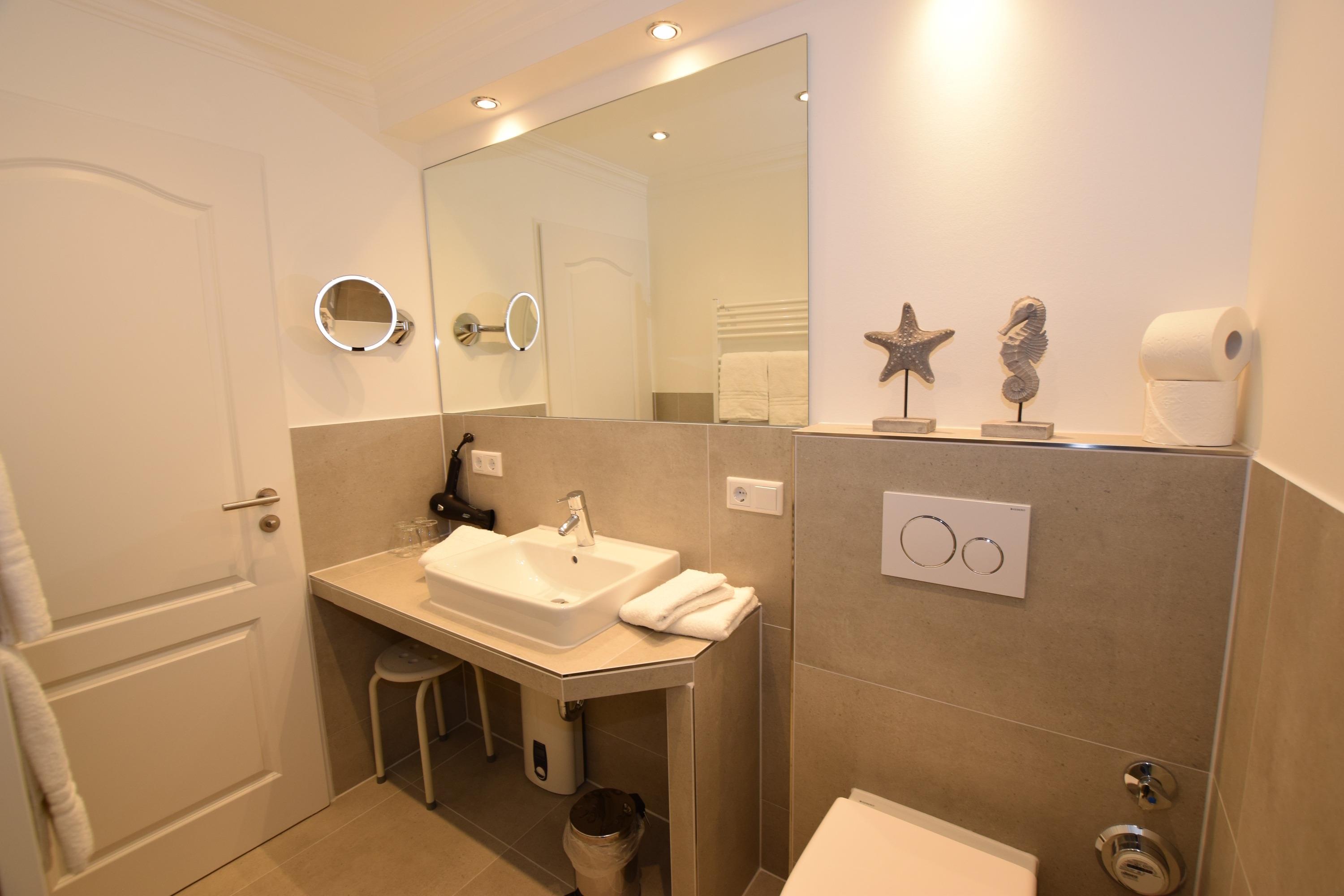 Im neuen Bad befinden sich eine Dusche, ein WC, ein Waschtisch, ein Handtuchtrockner und ein beleuchteter Kosmetikspiegel.