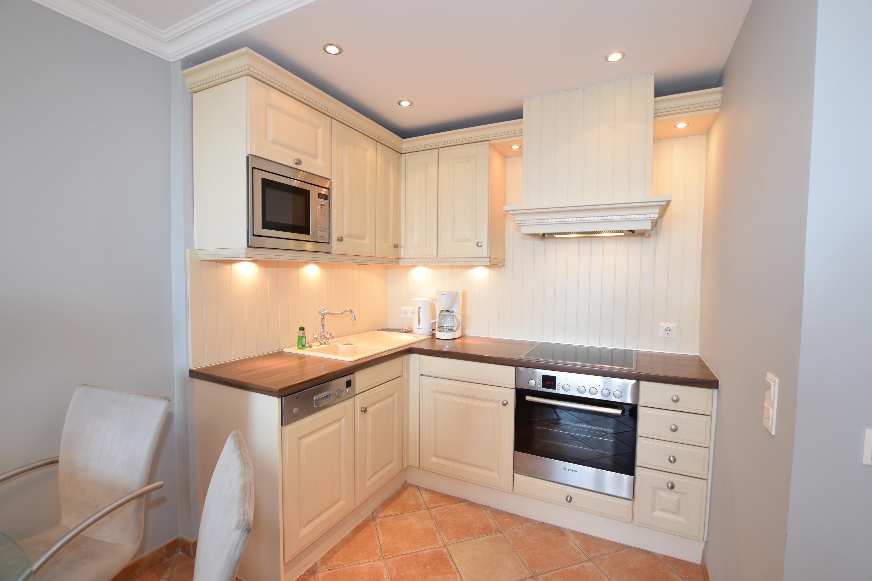 Die offene Pantryküche hat einen Geschirrspüler, eine Mikrowelle, einen Herd mit Backofen und Ceranfeld sowie einen Kühlschrank mit 3-Sterne-Gefrierfach. Nespresso- und Filterkaffeemaschine, Wasserkocher und Toaster gehören zur Grundausstattung.