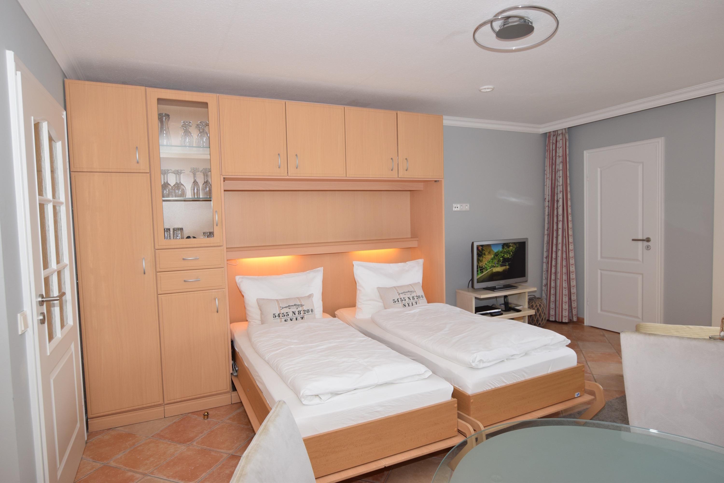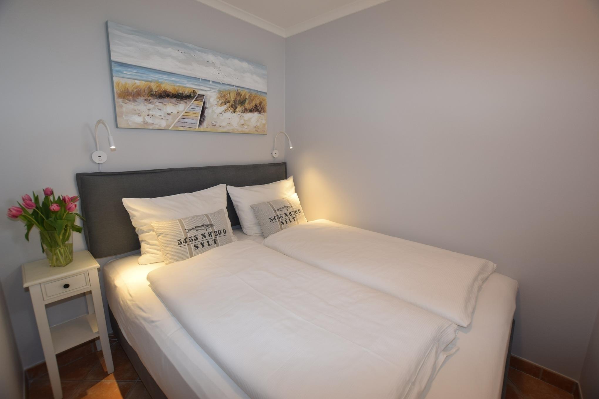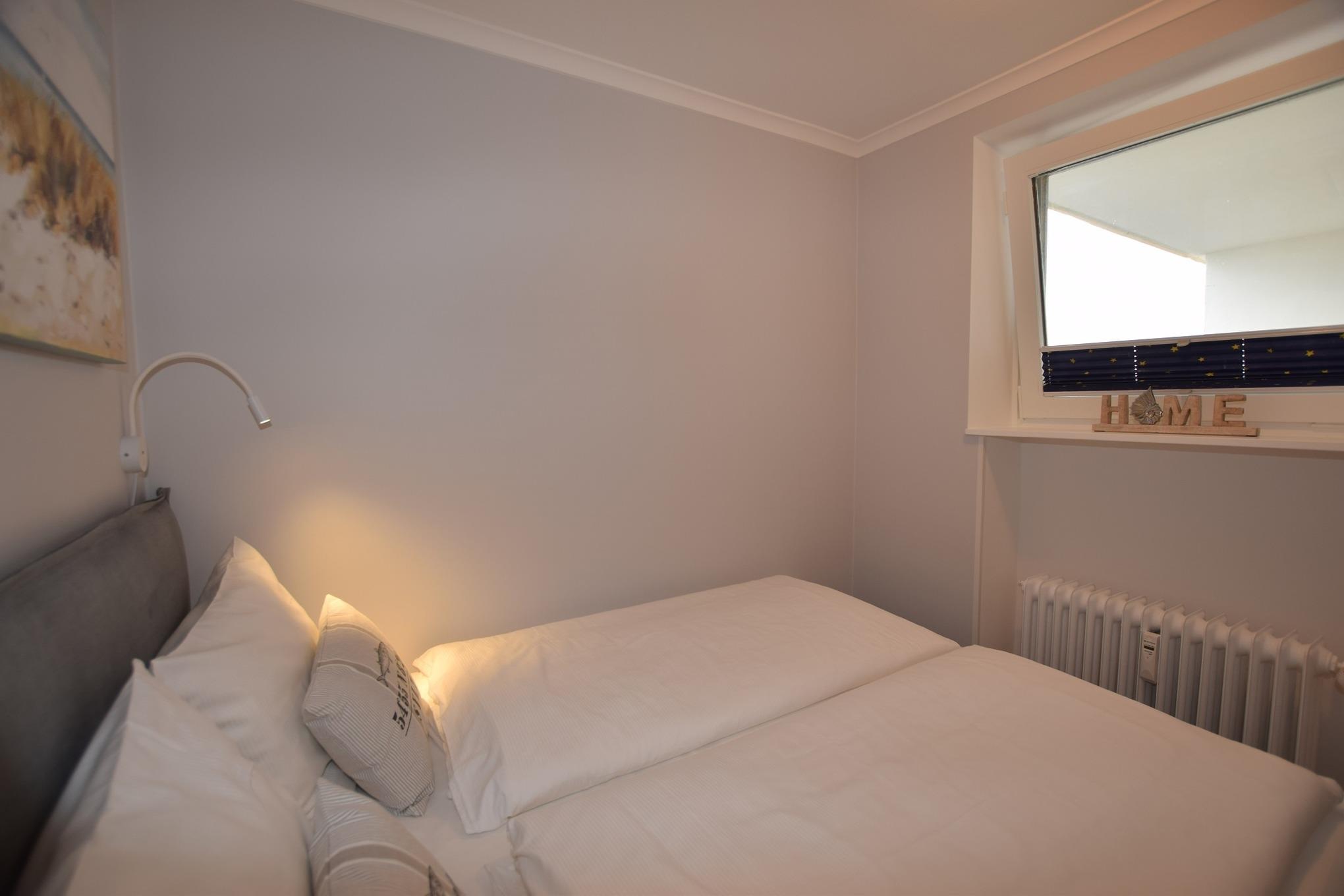 Vom Wohnzimmer gelangt man in das kleine Schlafzimmer mit Doppelbett (1,60 x 2,00 m) mit Einzelmatratzen für guten Schlafkomfort.