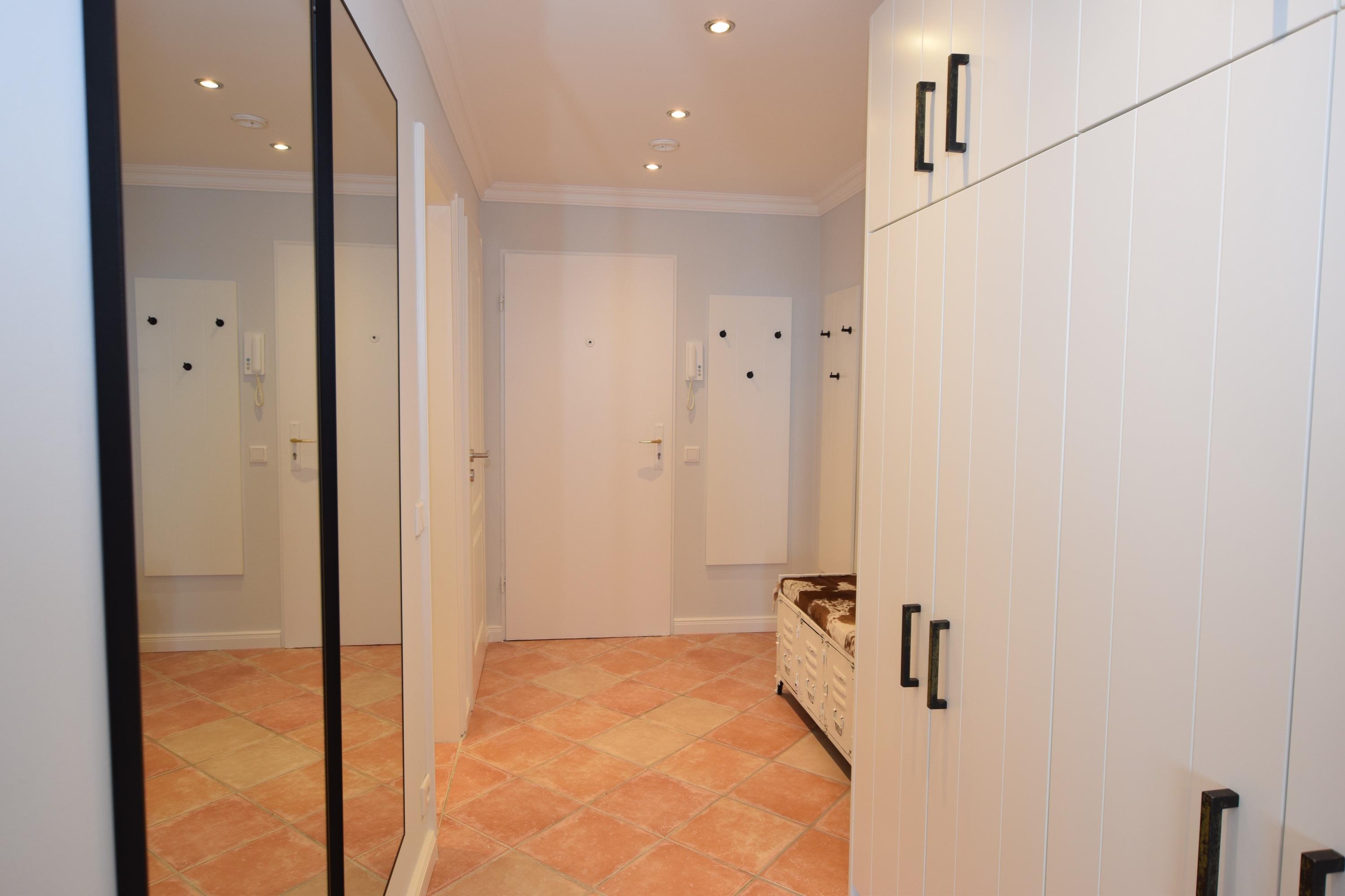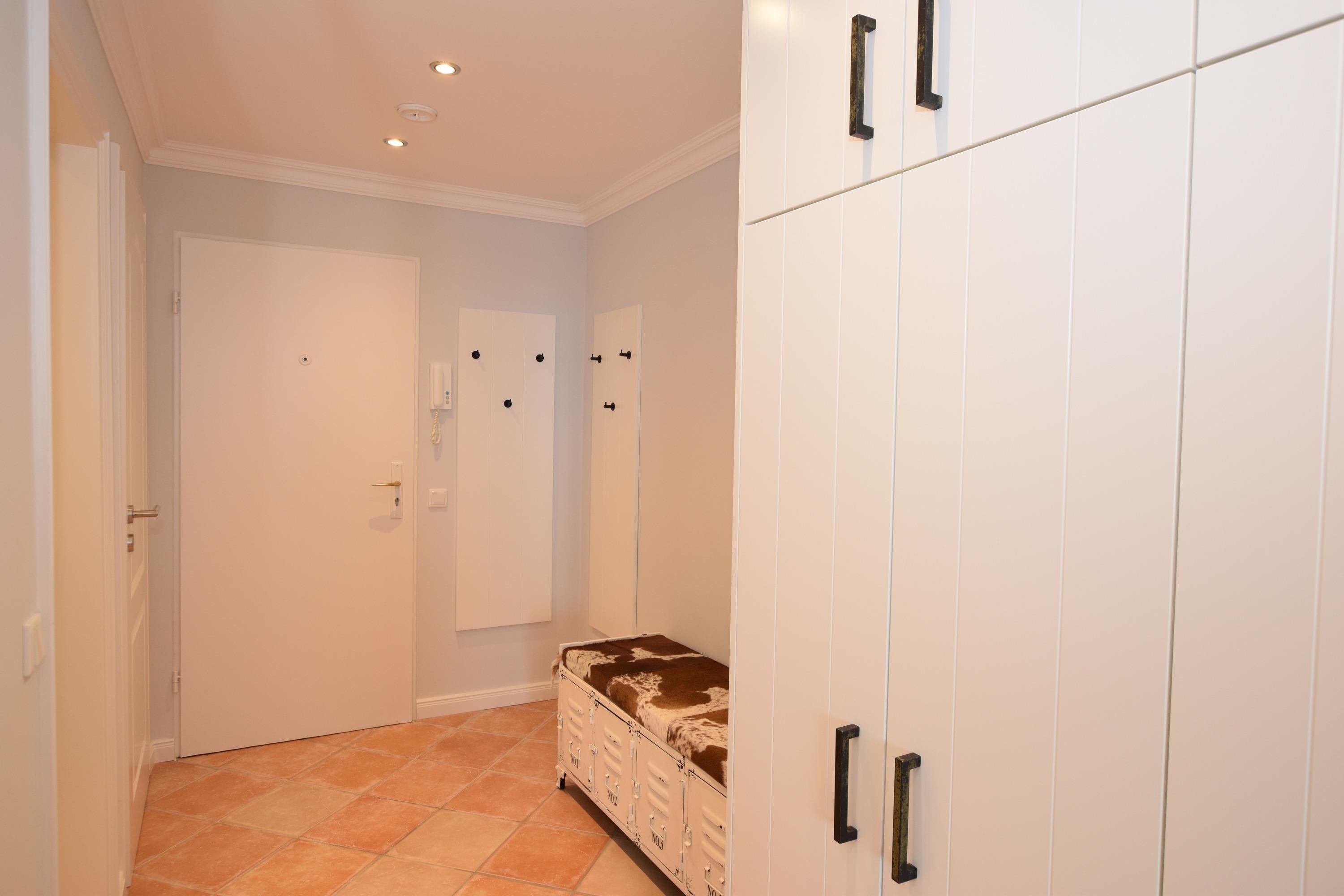 Vom Vorflur mit Garderobe gelangt man in das Wohnzimmer (mit Austritt zum Balkon) und in das neuwertige Duschbad/WC.
