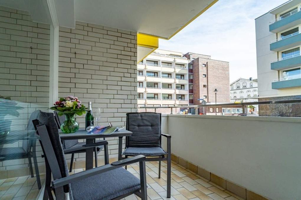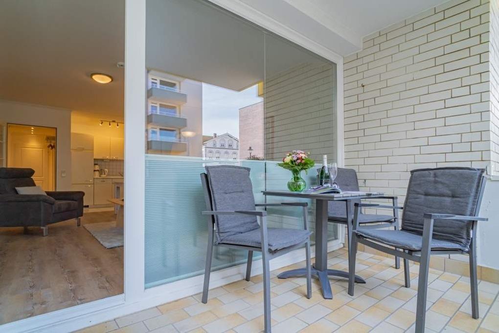 Balkonmöbel (auf dem Balkon oder in dem kleinen Abstellraum, der vom Balkon aus zugänglich ist) und Auflagen für max. 3 Personen sind vorhanden.