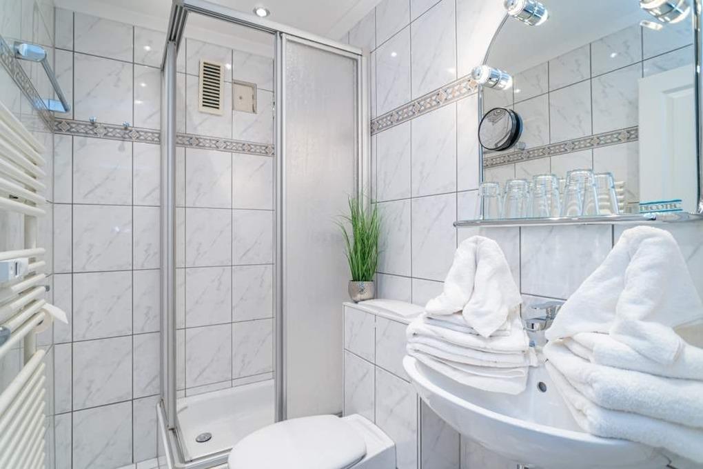 Im Bad mit abgehängter LED-Licht-Decke befindet sich die Dusche, der Waschtisch und WC.