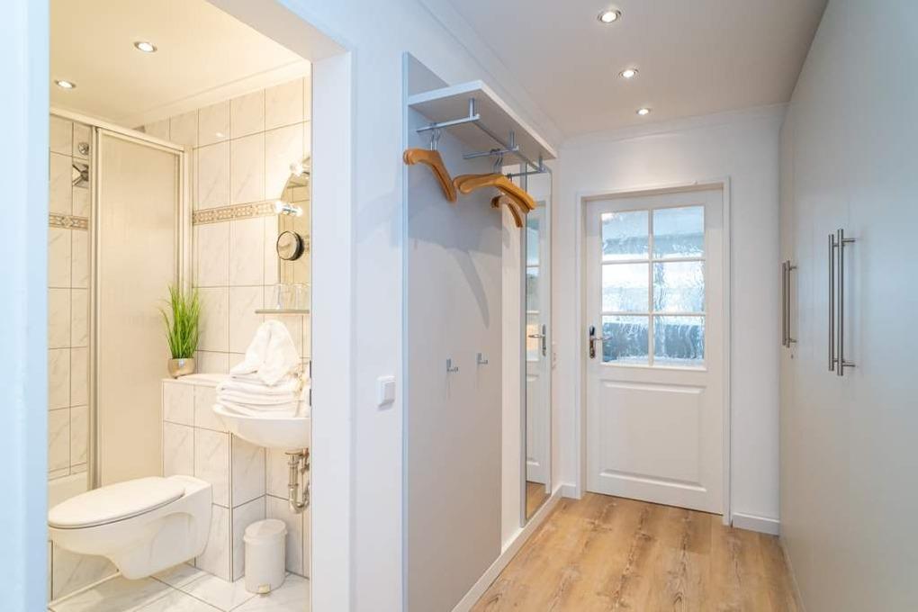 Vom Windfang mit Garderobe gelangt man in den Flur, der mit Einbauschränken ausgestattet ist.