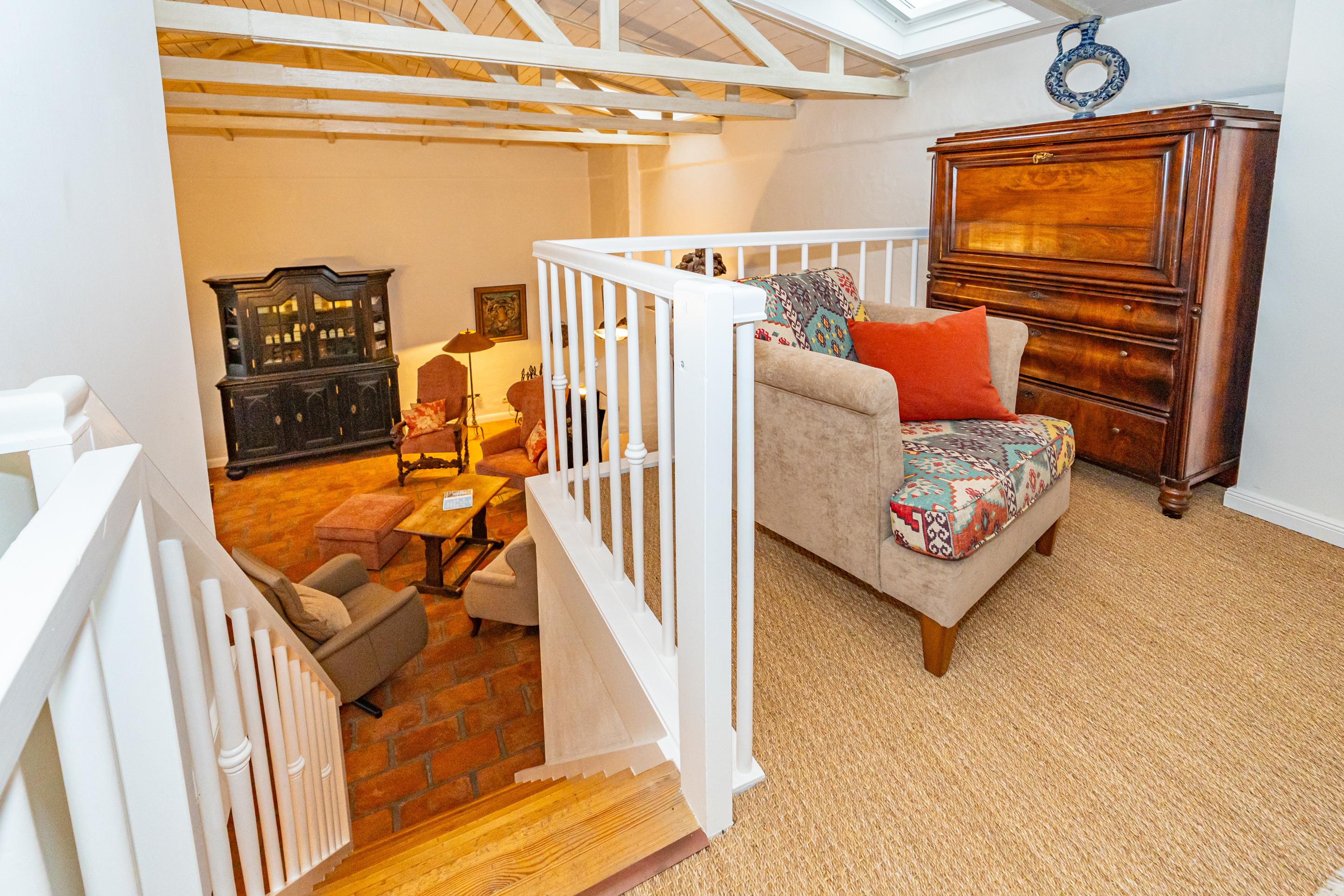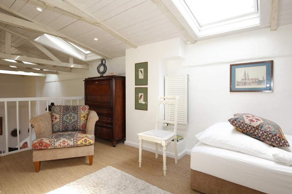 Im OG befinden sich zwei über Eck stehende Betten (0,90 x 2,00 m) und ein Sessel auf der offenen Empore.