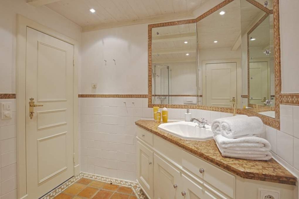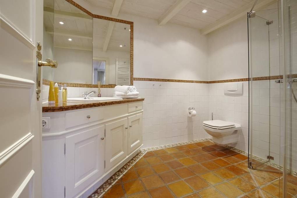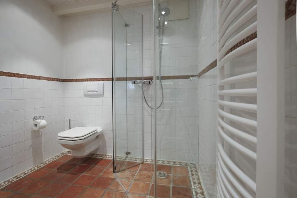 Im Bad befinden sich eine Dusche, ein WC und ein Waschbecken.