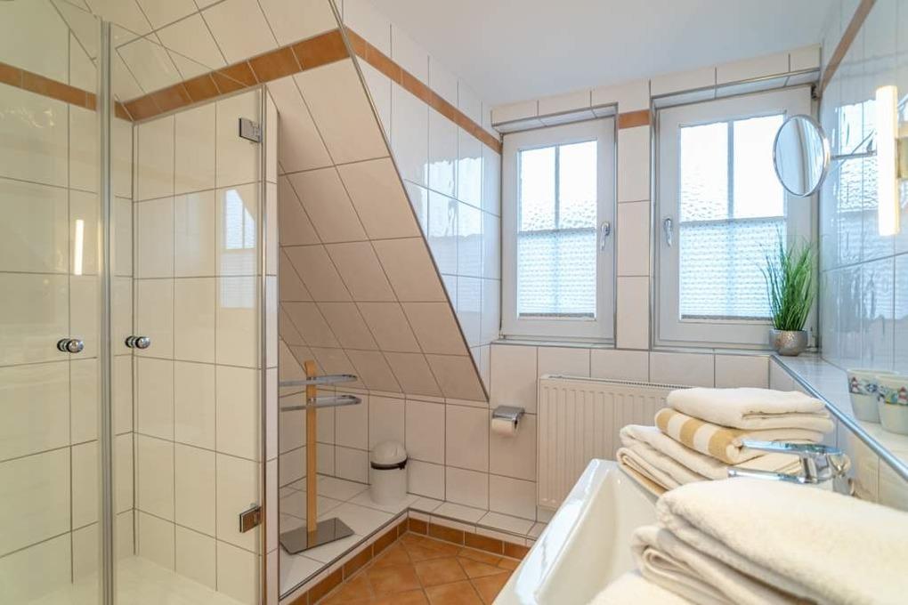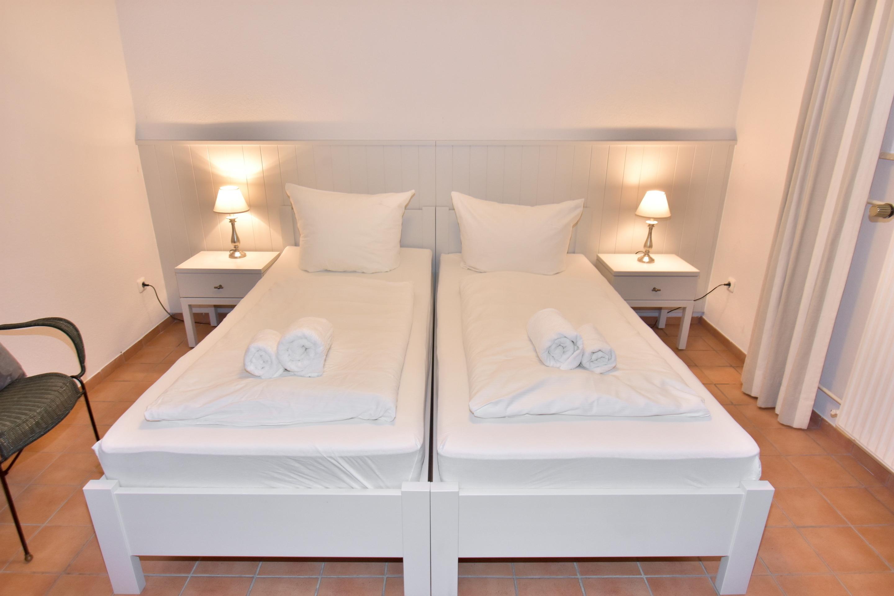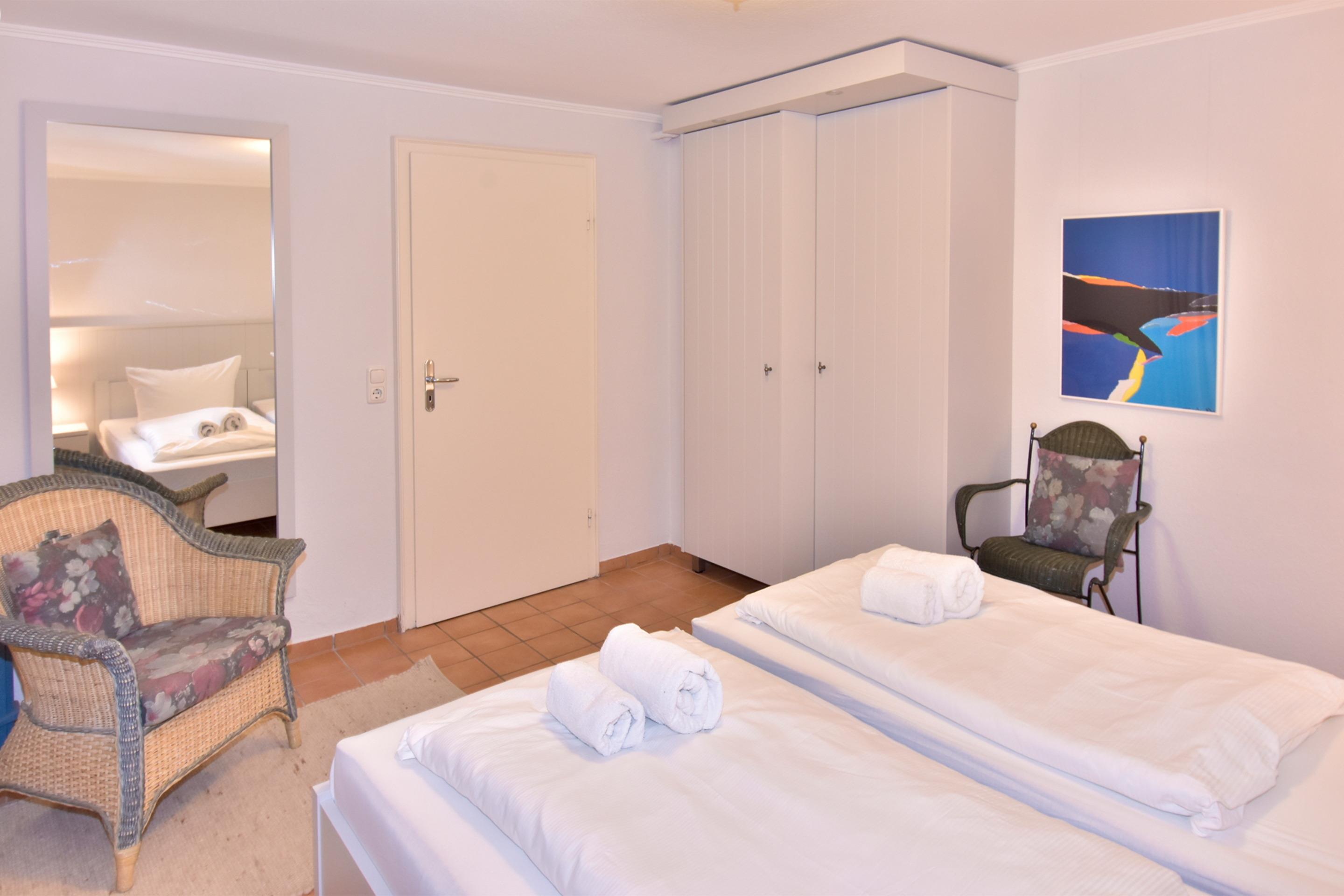 Im Objekt befinden sich zwei Schlafzimmer mit bequemen Doppelbetten, jeweils mit eigenem Duschbad/WC. Eines der Bäder ist zudem mit einer Waschmaschine ausgestattet. Ein weiteres Schlafzimmer mit zwei Einzelbetten und eigenem TV bietet zusätzlichen Rückzugsraum ideal auch für mitreisende Kinder oder Freunde.