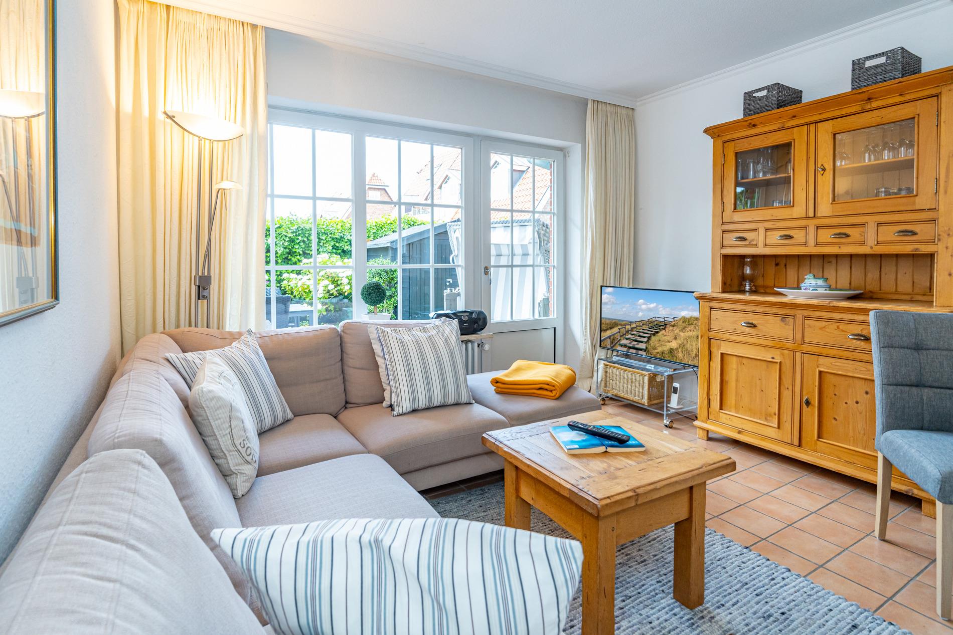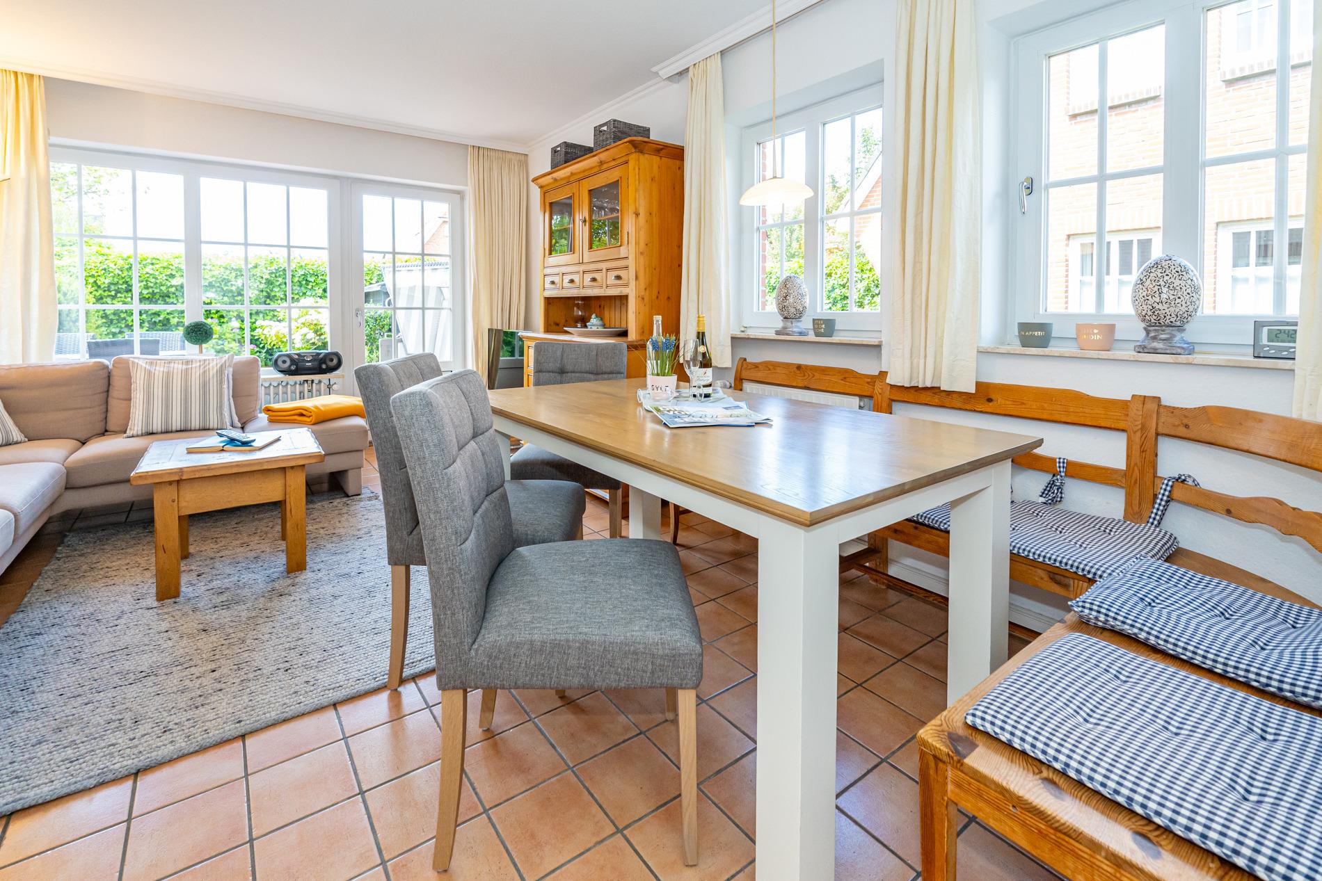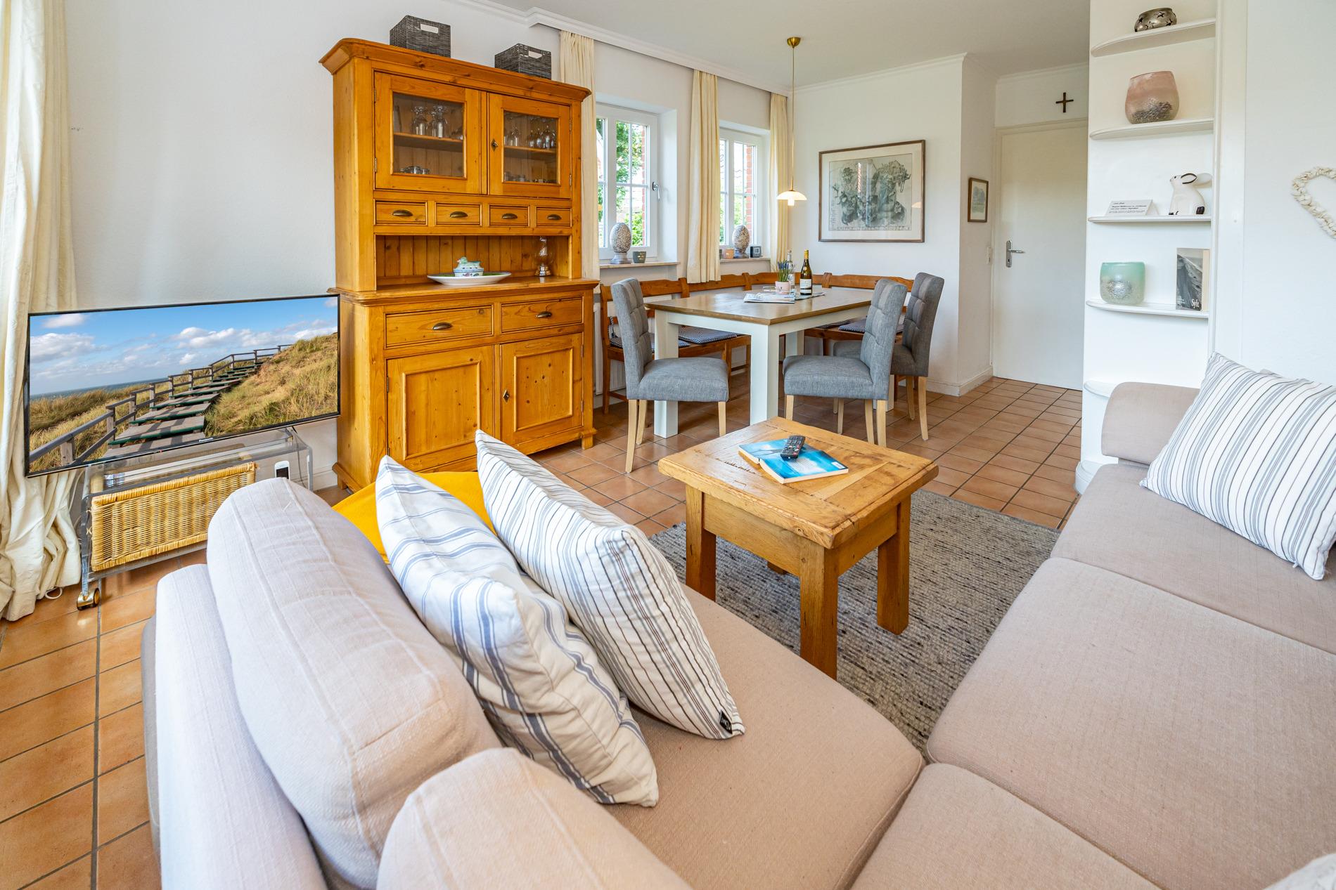 Diese großzügige Nichtraucher-Doppelhaushälfte bietet auf ca. 95?m² Wohnfläche ausreichend Platz für bis zu 6 Personen und liegt ruhig und familienfreundlich im Süden Westerlands nur etwa 10 Gehminuten vom Strand entfernt. Das Erdgeschoss überzeugt mit einem gemütlichen Wohnbereich inklusive bequemer Sitzecke, separatem Essplatz sowie moderner Unterhaltungstechnik (Flachbildfernseher, Radio/CD mit Stereo-Kassettendeck) und kostenfreiem WLAN-Zugang samt Telefonflatrate ins deutsche Festnetz. Die separate, voll ausgestattete Küche verfügt über einen Geschirrspüler, einen Backofen und einen großen Kühlschrank mit 3*-Gefrierfach – perfekt für entspannte Urlaubstage mit der ganzen Familie.