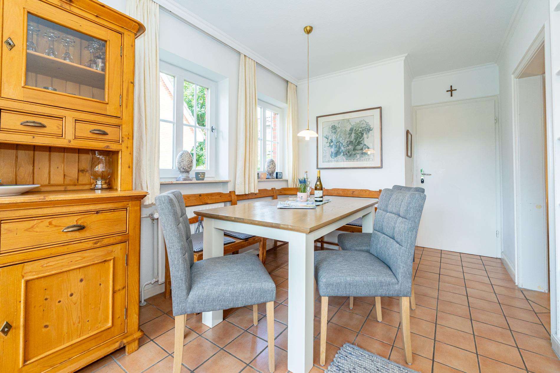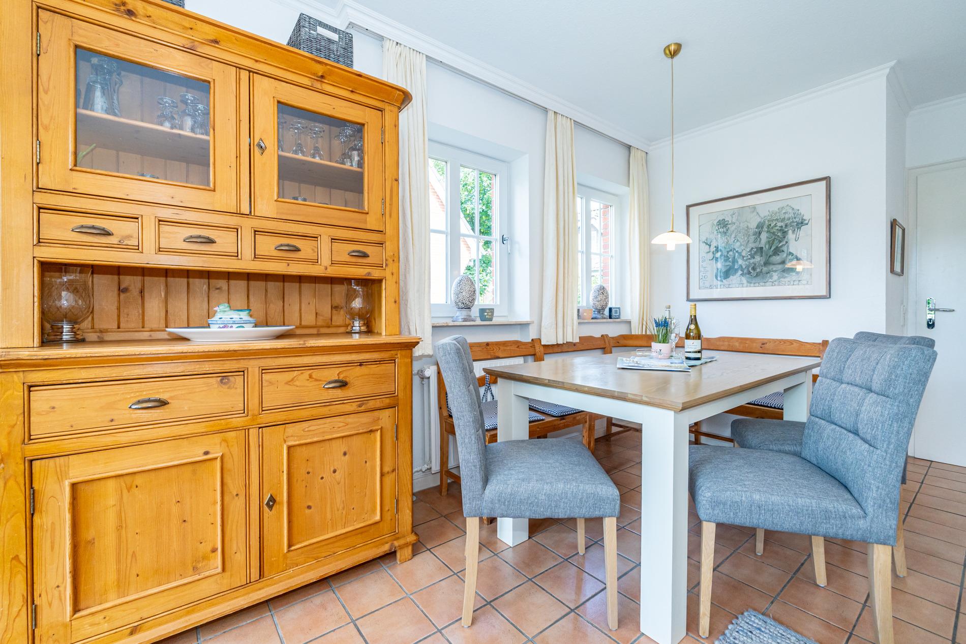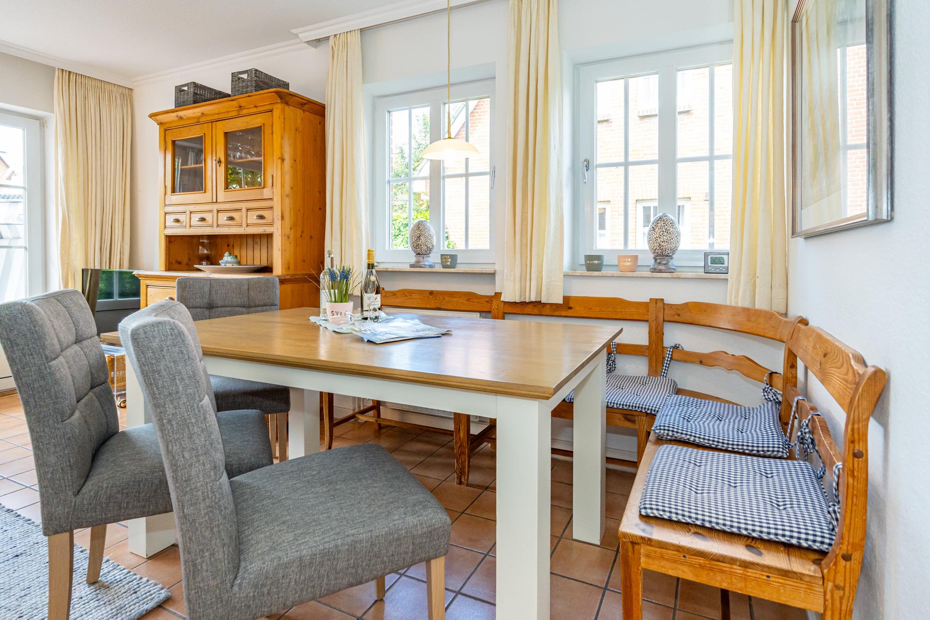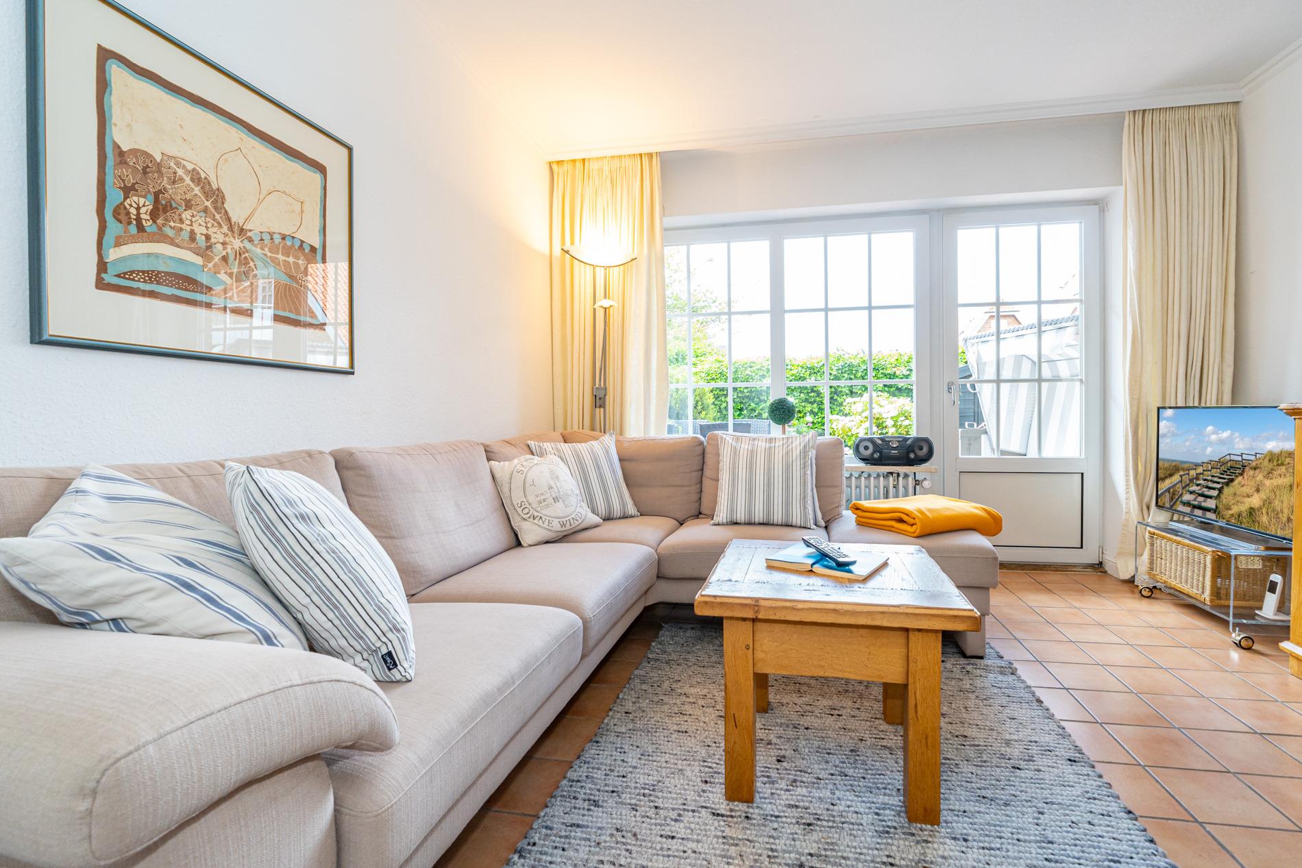 Diese großzügige Nichtraucher-Doppelhaushälfte bietet auf ca. 95?m² Wohnfläche ausreichend Platz für bis zu 6 Personen und liegt ruhig und familienfreundlich im Süden Westerlands nur etwa 10 Gehminuten vom Strand entfernt. Das Erdgeschoss überzeugt mit einem gemütlichen Wohnbereich inklusive bequemer Sitzecke, separatem Essplatz sowie moderner Unterhaltungstechnik (Flachbildfernseher, Radio/CD mit Stereo-Kassettendeck) und kostenfreiem WLAN-Zugang samt Telefonflatrate ins deutsche Festnetz. Die separate, voll ausgestattete Küche verfügt über einen Geschirrspüler, einen Backofen und einen großen Kühlschrank mit 3*-Gefrierfach – perfekt für entspannte Urlaubstage mit der ganzen Familie.