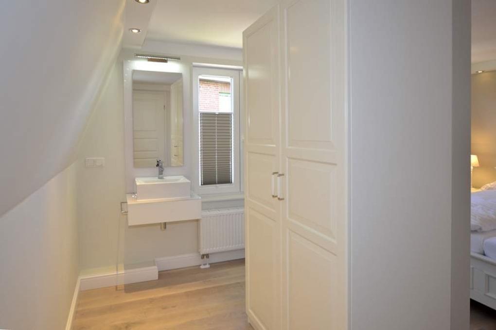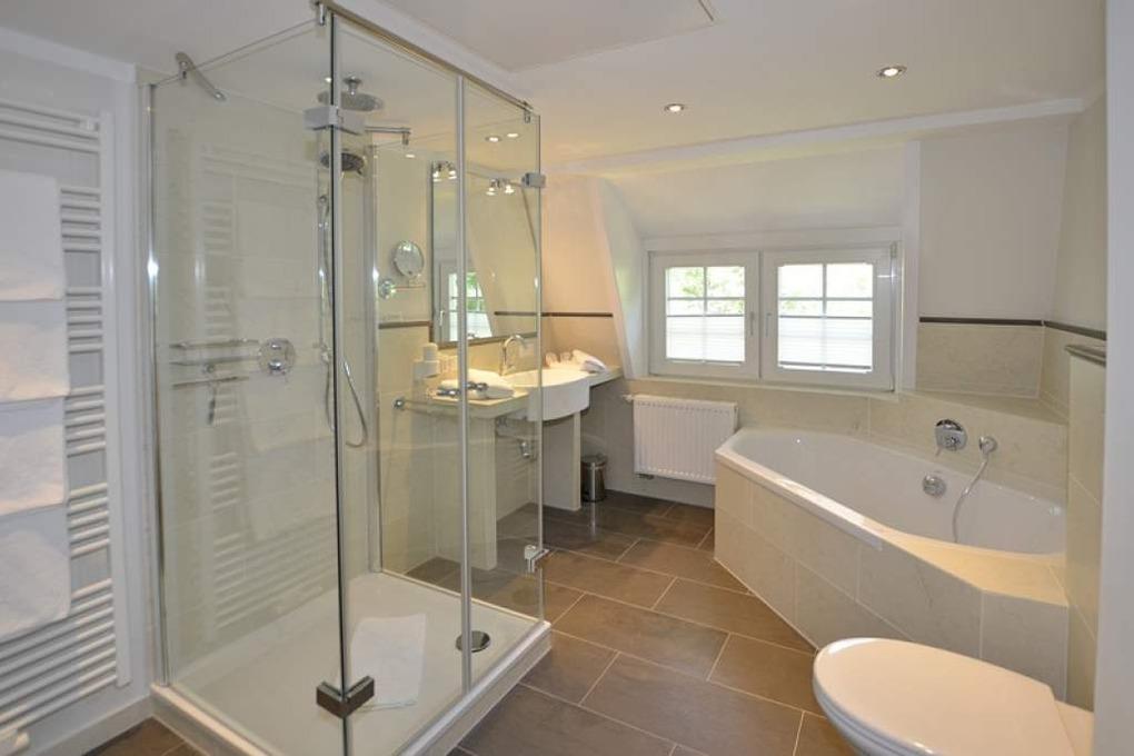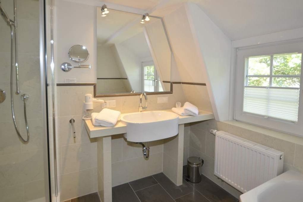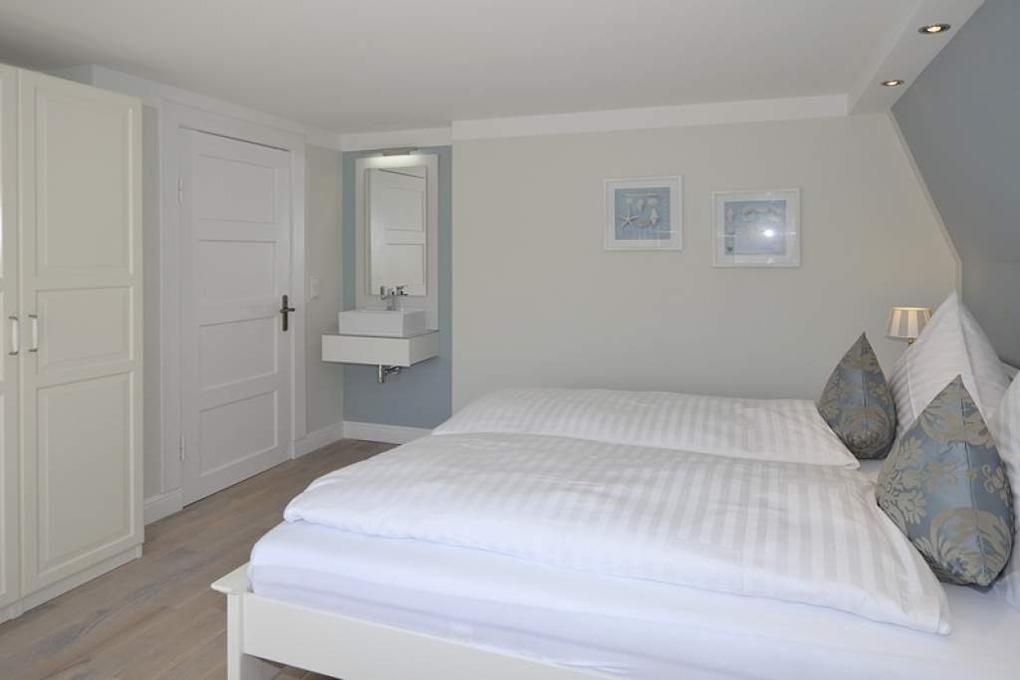 Obergeschoss: Im Obergeschoss befinden sich 2 Schlafzimmer jeweils mit Doppelbetten (1,80 x 2,00 m, Bettdecke in Überlänge), Flachbild-TV und Fußboden aus Echtholzparkett. Mittig zwischen den Doppel-Schlafzimmern liegt ein großzügiges Wannenbad mit separater Dusche, Waschtisch, Handtuchtrockner, Fön und WC.