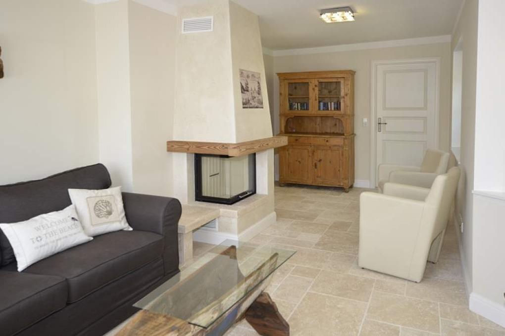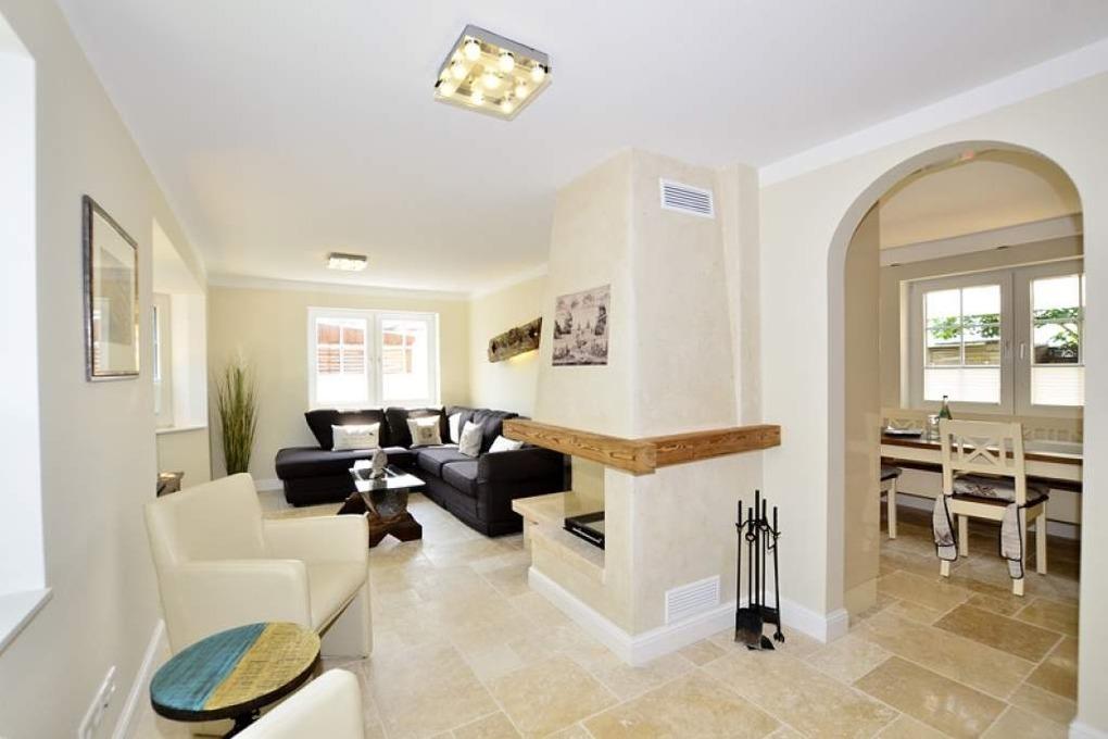 Erdgeschoss: Wohnzimmer mit hellem Natursteinboden und Erker, mit nach 2 Seiten offenem Kamin mit echten Delfter Fliesen, Ecksofa mit 2 Sesseln, Sat-Flachbild-TV, W-Lan und Telefonflat ins Deutsche Festnetz (Handynummern gesperrt).