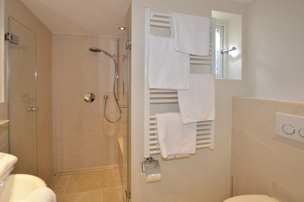 Die geräumige, halboffene Küche mit Essecke hat einen Geschirrspüler, ein 4-Platten-Ceranfeld mit Backofen und einen Kühlschrank mit 3-Sterne Gefrierfach. Kaffeemaschine, Nespresso Kapselmaschine, Wasserkocher und Toaster gehören zur Grundausstattung. Von der Küche gelangt man in ein Zwischenzimmer mit Waschmaschine, Trockner und Austritt auf die geschützte Westterrasse. Zusätzlich befindet sich im Erdgeschoss ein Einzelschlafzimmer (0,80 x 2,00 m, Bettdecken in Überlänge) und ein Gäste-WC.