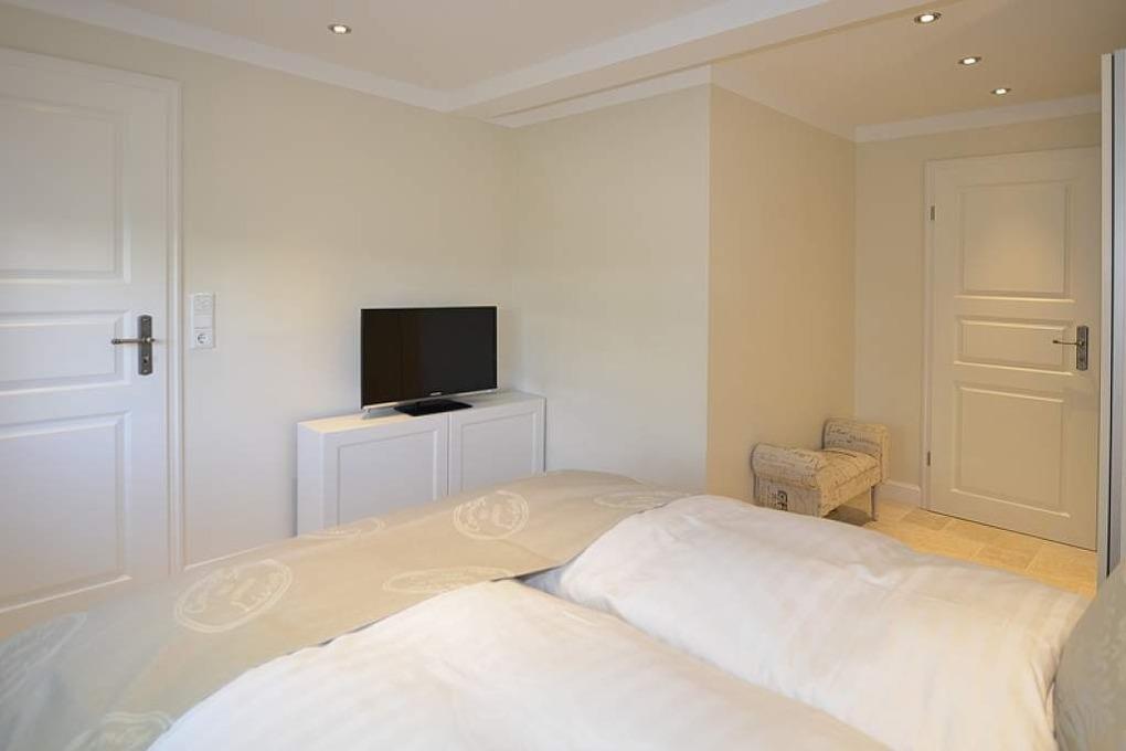 Ein Schlafzimmer mit Doppelbett (1,60 x 2,00 m, zwei Einzelmatratzen, Bettdecken in Überlänge) mit Flachbild-TV und eigenem Duschbad mit WC.