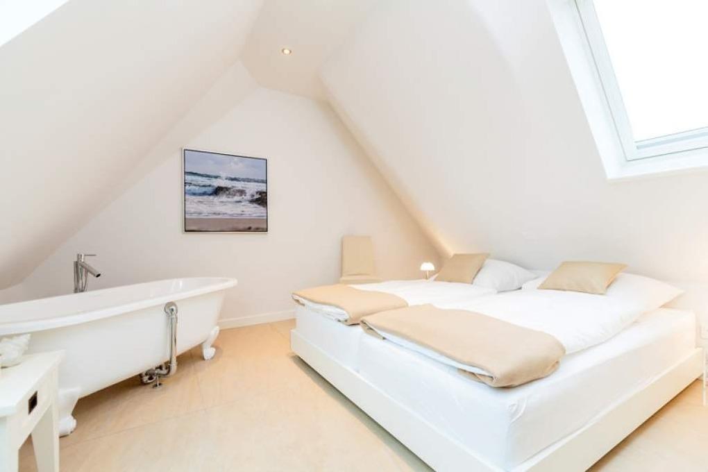 Im Dachgeschoss befindet sich ein geräumiges Doppel-Schlafzimmer mit Boxspringbett in optimaler Liegehöhe (Kinderzustellbett möglich), freistehender Designbadewanne und einem weiteren Flachbild-TV sowie eine offene Empore mit Einzel-Alkoven-Bett (Boxspringbett).