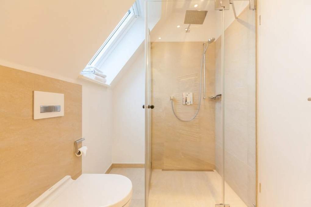 Das neue Bad lässt mit moderner Regendusche, Fön, Kosmetikspiegel, Waschtisch, Handtuchwärmer und WC keine Wünsche offen.
