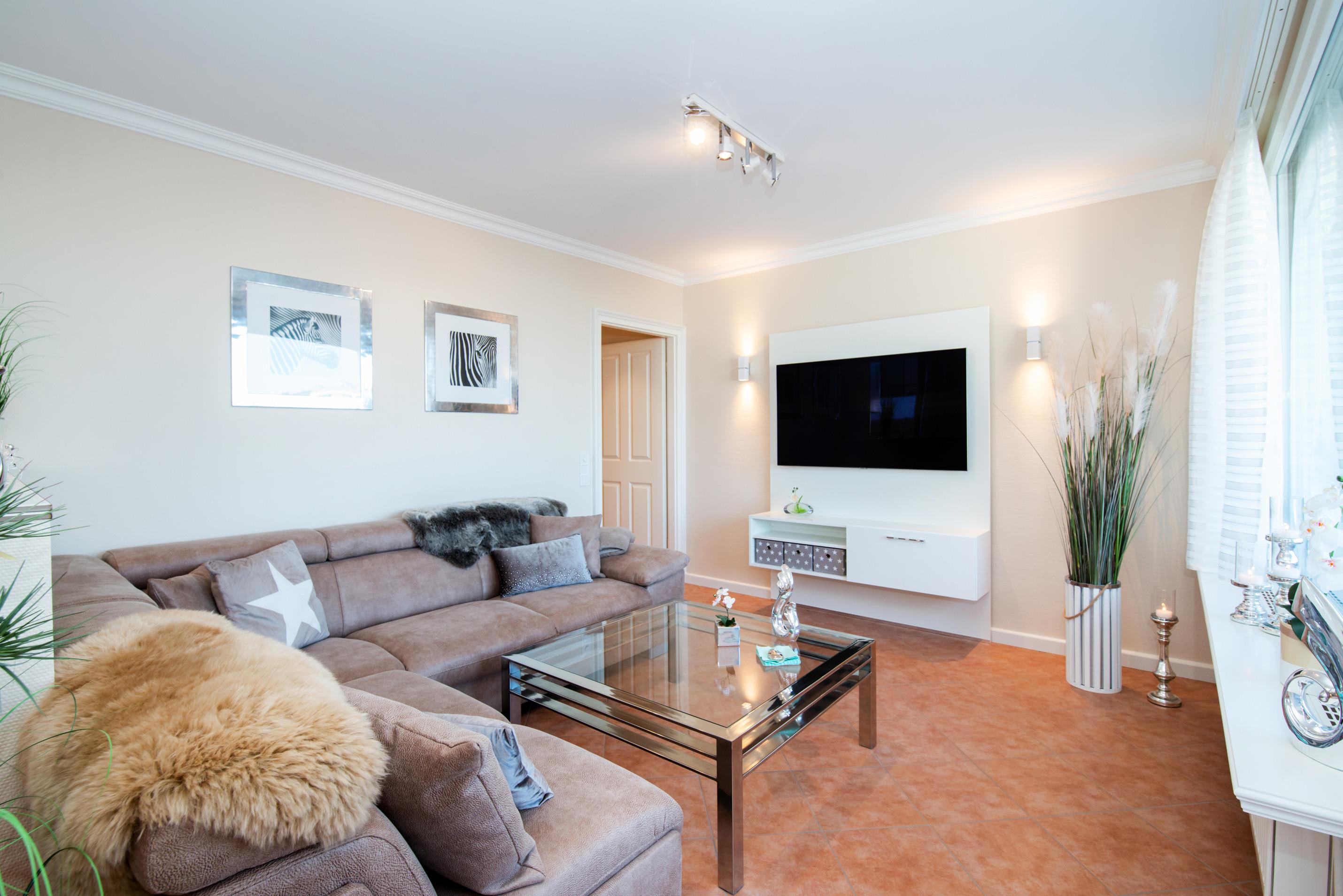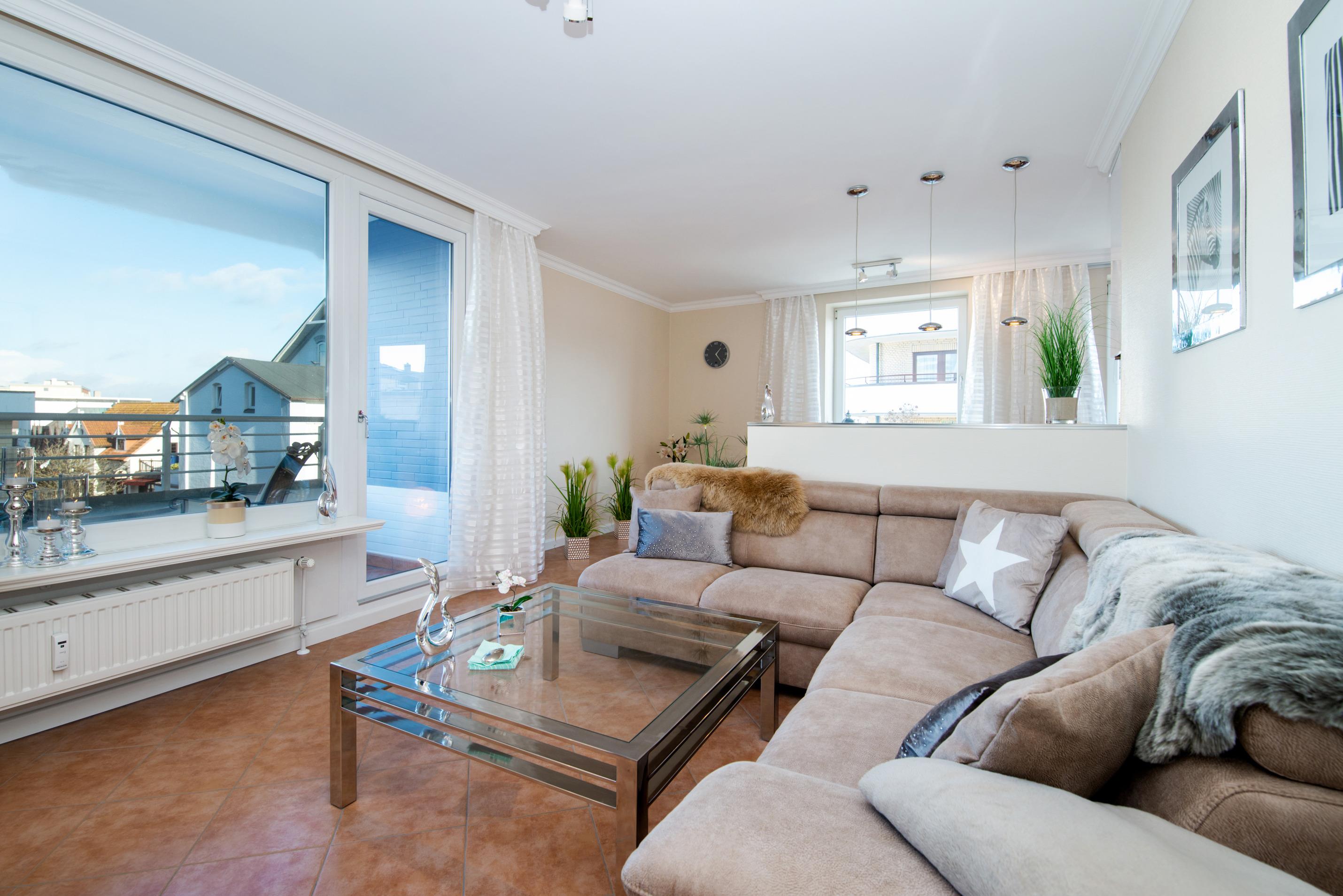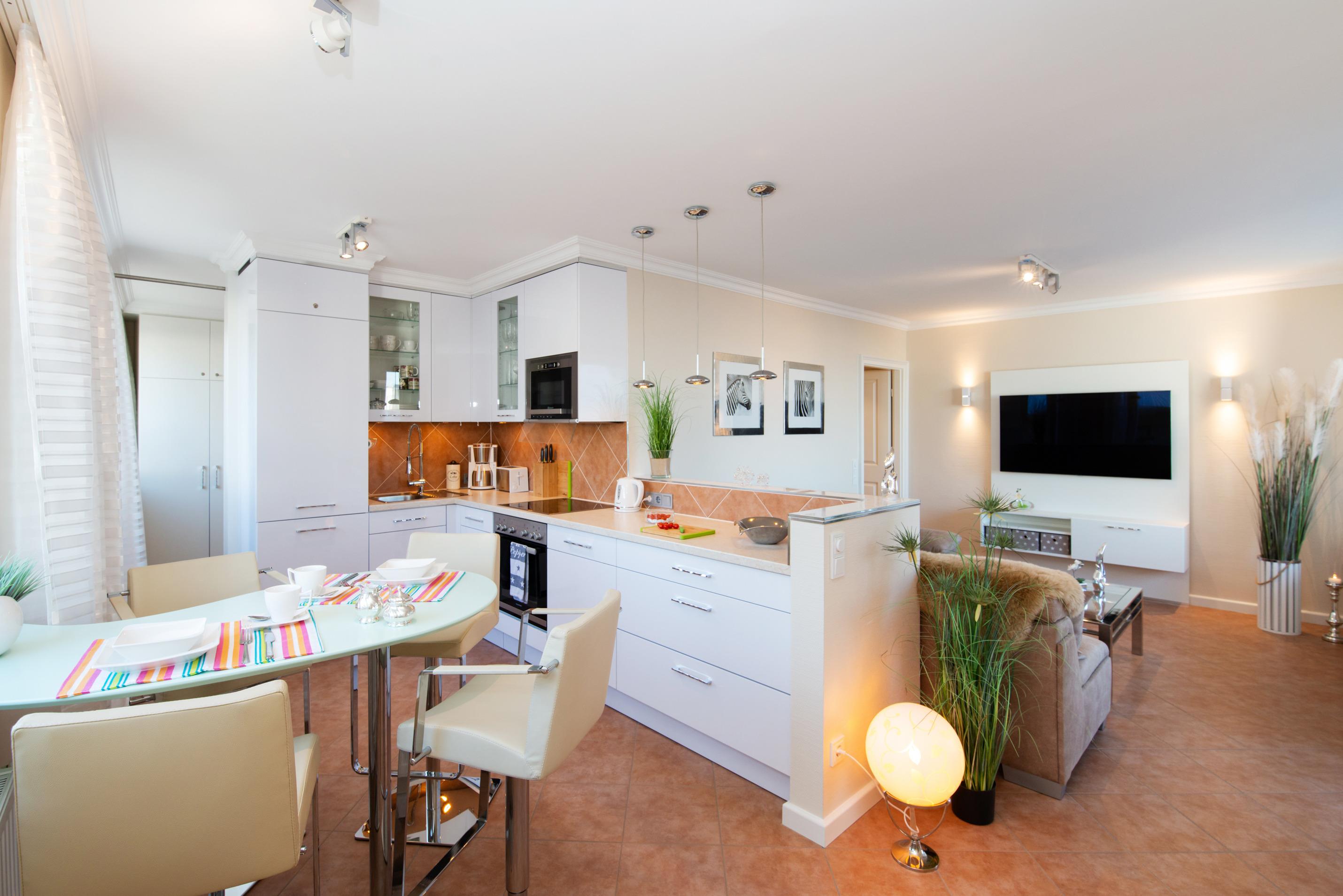 Im hellen Wohnzimmer befindet ein gemütliches Ecksofa, ein großer Kabel-Flachbild-TV, die offene XL-Einbauküche mit separatem Essplatz (Hochtisch mit stylischen Tresenstühlen) vor breiter Fensterfront und der Zutritt zur Nordostloggia.