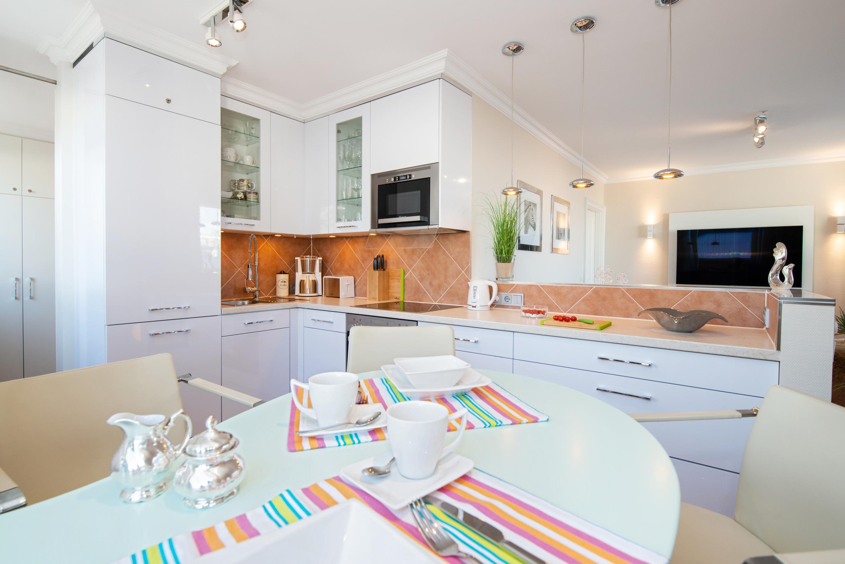 Die voll ausgestattete Küche lässt kaum Wünsche offen. Sie besitzt einen Herd mit Cerankochfeld (4 Felder) mit Backofen, einen Geschirrspüler, Mikrowelle, Kühlschrank mit Gefrierfach und eine Waschmaschine.