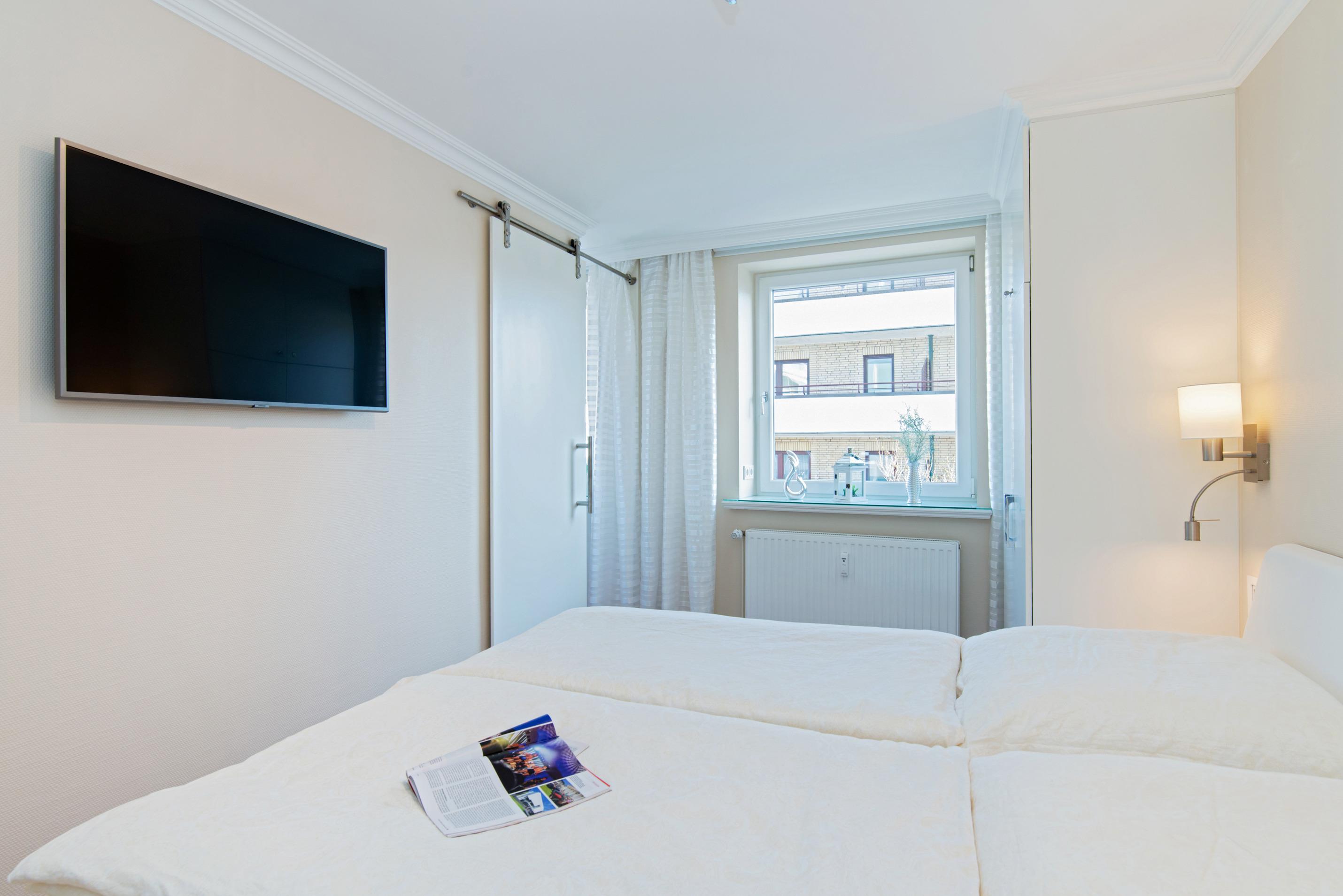 Das von der Küche und der Diele aus begehbare Schlafzimmer ist mit einem guten Doppelbett (2 Einzelmatratzen, jeweils 2 m x 0,90 m) und einem weiteren Kabel-Flachbild-TV (Wandmontage) ausgestattet.