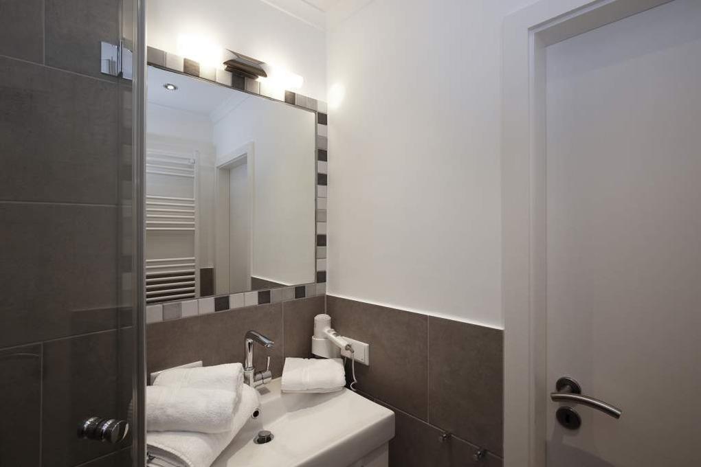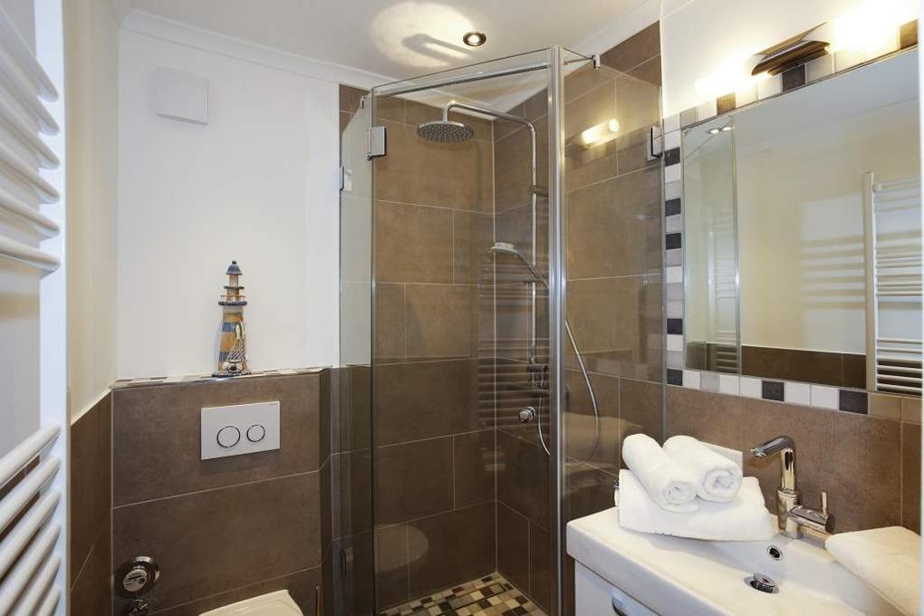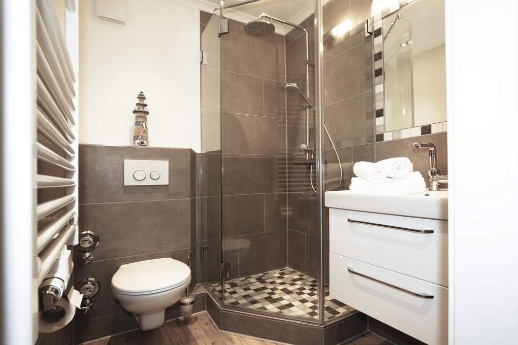 Im Bad befinden sich eine Dusche, ein WC und ein Waschtisch.